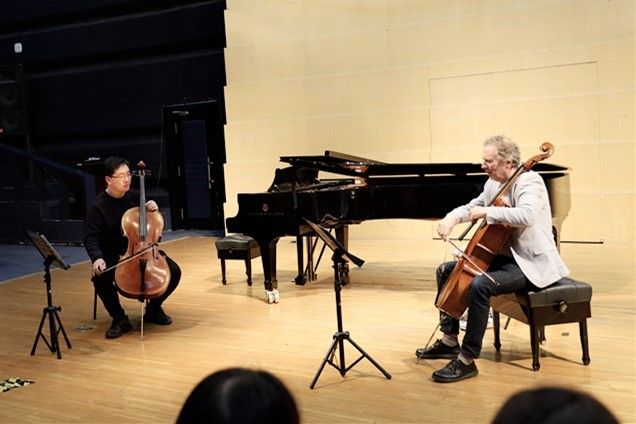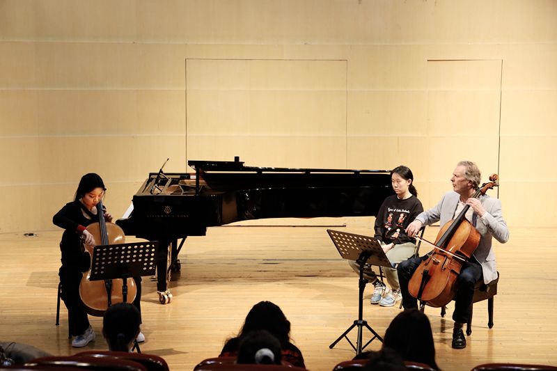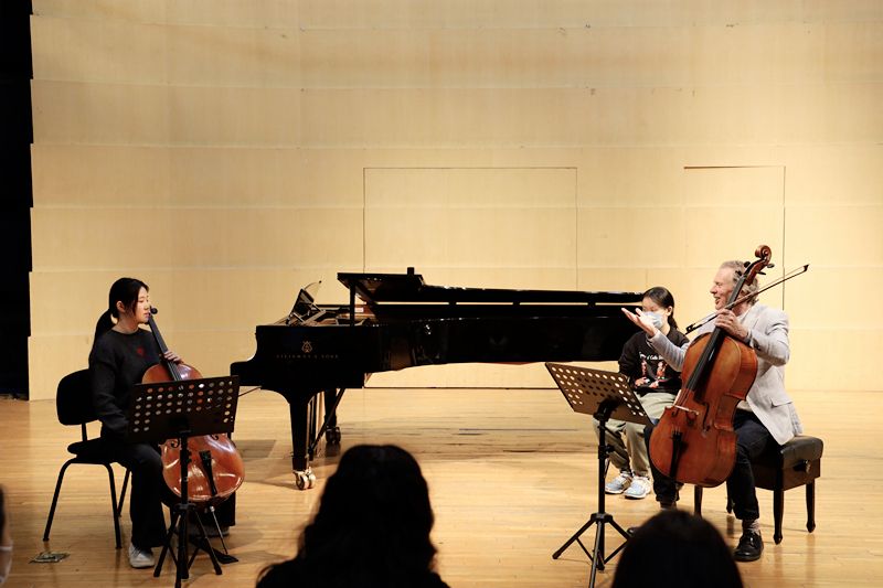 大师课现场,尼古拉斯·琼斯教授以诙谐幽默的授课风格,指导五位央音管弦系本科生——朱原玉婕、祝熙杰、鲍佳茵、张敬尧、姬儒涵,分别演奏了勃拉姆斯《e小调大提琴奏鸣曲》(第一乐章)、肖斯塔科维奇《大提琴协奏曲》(第二乐章)、德沃夏克《b小调大提琴协奏曲》、肖斯塔科维奇《第一大提琴协奏曲》(第三、四乐章)及舒曼《a小调大提琴协奏曲》(第二、三乐章),详细分析了每首作品的情感表达,并针对每位学生的不同演奏特点提出具体建议和指导。