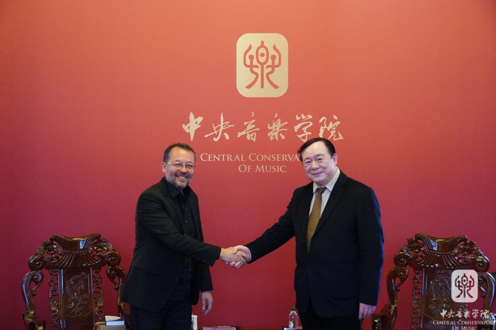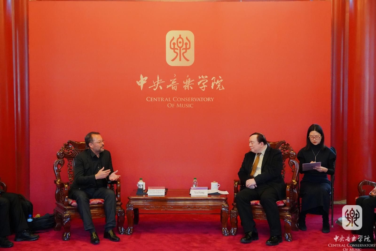 会谈后,代表团一行观看了AC米兰中文官网交响乐团与打击乐专业白伟岐老师合作表演的《被拯救的阿尔贝里希》(克里斯托弗·劳斯作曲)和陈冰教授指挥民族室内乐团表演的《阳关三叠》《依帕内玛女孩》《茉莉青春》等精彩演出。费尔南多院长与打击乐专业师生交流分享了巴西音乐。