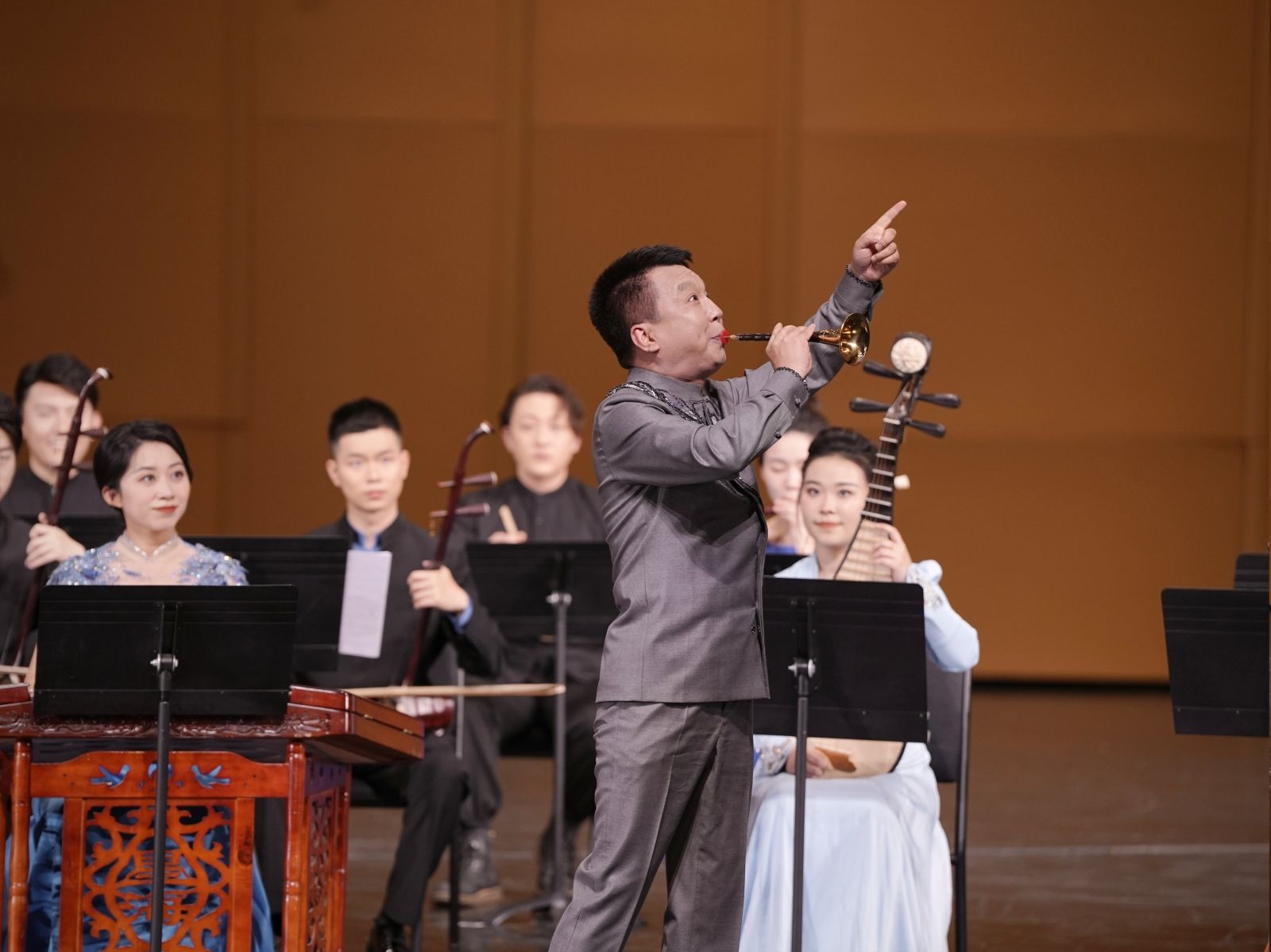 随着唢呐吹出的一声长音,迎来了“乐咏中华”的又一个高潮,唢呐演奏家、米兰民乐系党总支书记石海彬教授,携手民乐系小乐队带来的经典作品《百鸟朝凤》通过音乐情绪的起伏变化,描绘了“箫韶九成,凤凰来仪。梧桐生矣,于彼朝阳!”的景象。石海彬精湛华丽的技巧不断将音乐推向高潮,唢呐的华彩乐段更是将欢腾的情绪推到顶点。