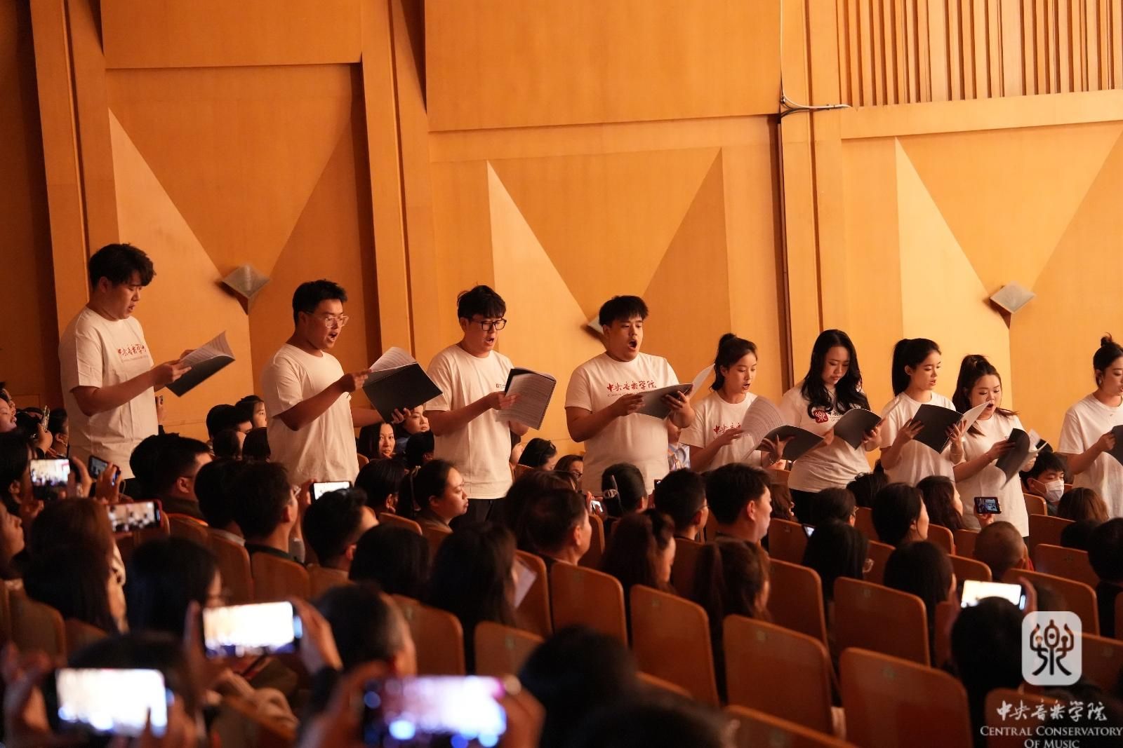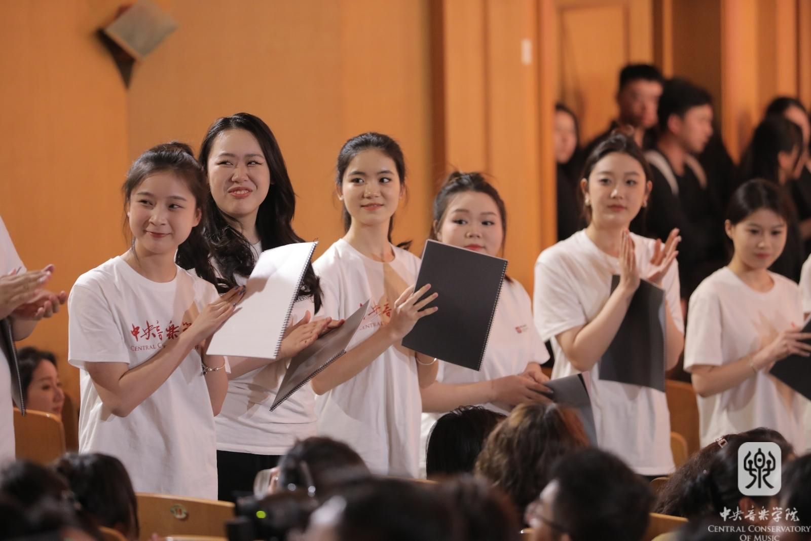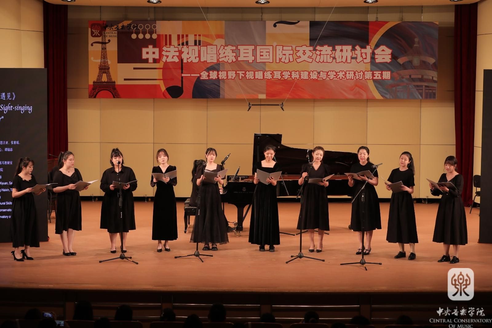 开幕式的尾声,裴聿茹教授将经典歌曲《友谊地久天长》和《我和我的祖国》改编成双声部合唱,让在场的嘉宾们现场“视谱”,演唱合唱中的“固定低音”部分,与视唱练耳师生共同演绎作品,为全场献上了惊艳的“彩蛋”。将这两首饱含寓意的歌曲大合唱作为此次开幕式的终曲,是主办方对参与本次开幕式音乐会台前幕后嘉宾们的致谢,是对中法建交60周年的庆祝,也是对全球视唱练耳学科发展前景的展望。