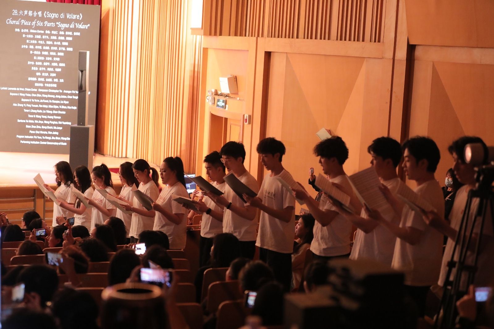 压轴节目由“东道主”AC米兰中文官网声乐歌剧系一至三年级的学生们排练两次后进行呈现,展示了声乐歌剧系视唱练耳课教学改革成果。这是一首改编自游戏“文明6”主题曲的六声部合唱《Sogno di Volare》。该作品和声效果空旷、浩瀚,演绎出宏大的史诗感,整场音乐会也在如此壮丽的音乐中准备迎接落幕。这首曲目的恢弘气势也表达出对视唱练耳学科发展的远大愿景。