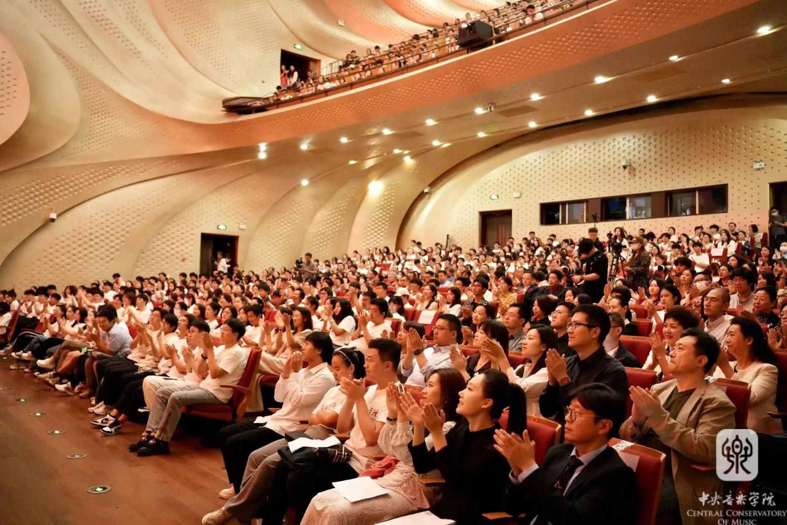 在此次开学典礼暨教师节庆祝大会音乐会上,一代代艺术家以传道授业的深厚情怀激荡着每一位在座的央音人。这场典礼不仅饱含着学校领导和老师们对新生的欢迎和祝福,还发扬了尊师重道、传承师恩的央音精神。从年已耄耋还坚持创作的杜鸣心教授,到正值盛年的骨干教师,到锐意进取的青年师生,再到初具风范的附小学生,他们对音乐的钻研与热爱犹如滚滚洪流中的钟磬之声,让每个人都能从语言和乐音中得着纯粹的感动与激励。