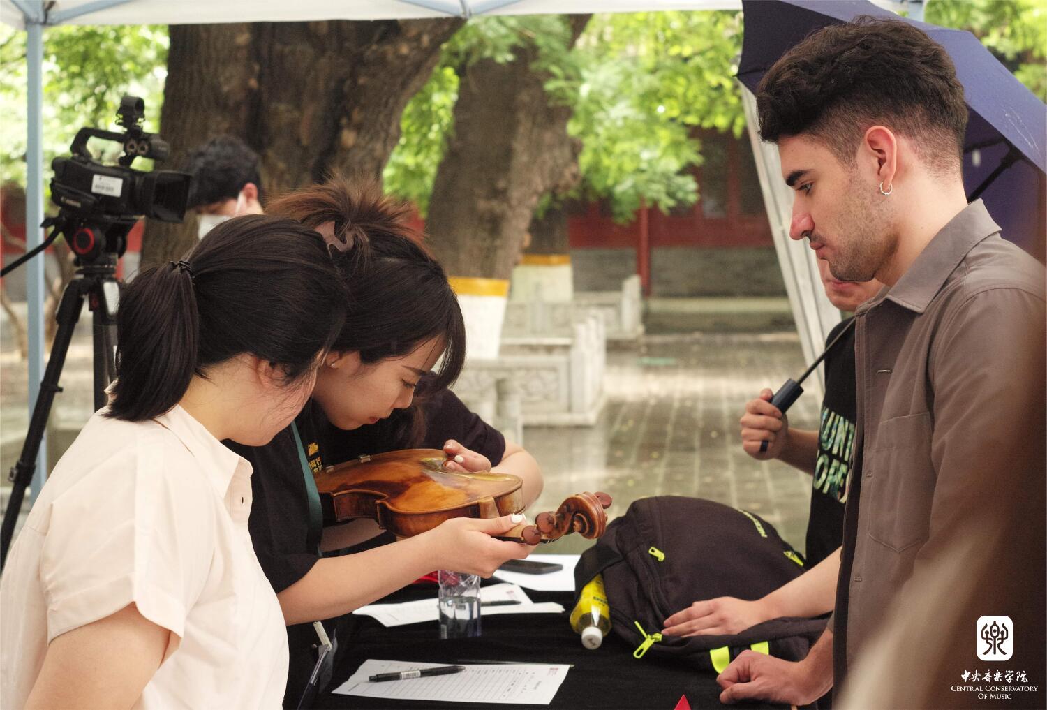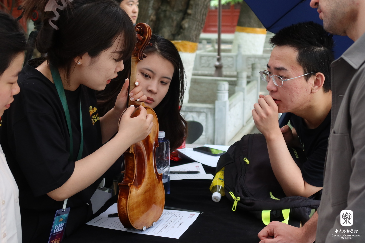 中午时分,“为你的提琴做一次体检”提琴制作党团青年公益爱心活动在央音王府南大殿前如期举办。提琴制作研究中心的同学们在主科教师逯翔、王瑜慧、潘东昊等老师的带领下为弦乐演奏的同学们开展了提琴状态评估检测服务。前来测评的弦乐演奏同学络绎不绝。