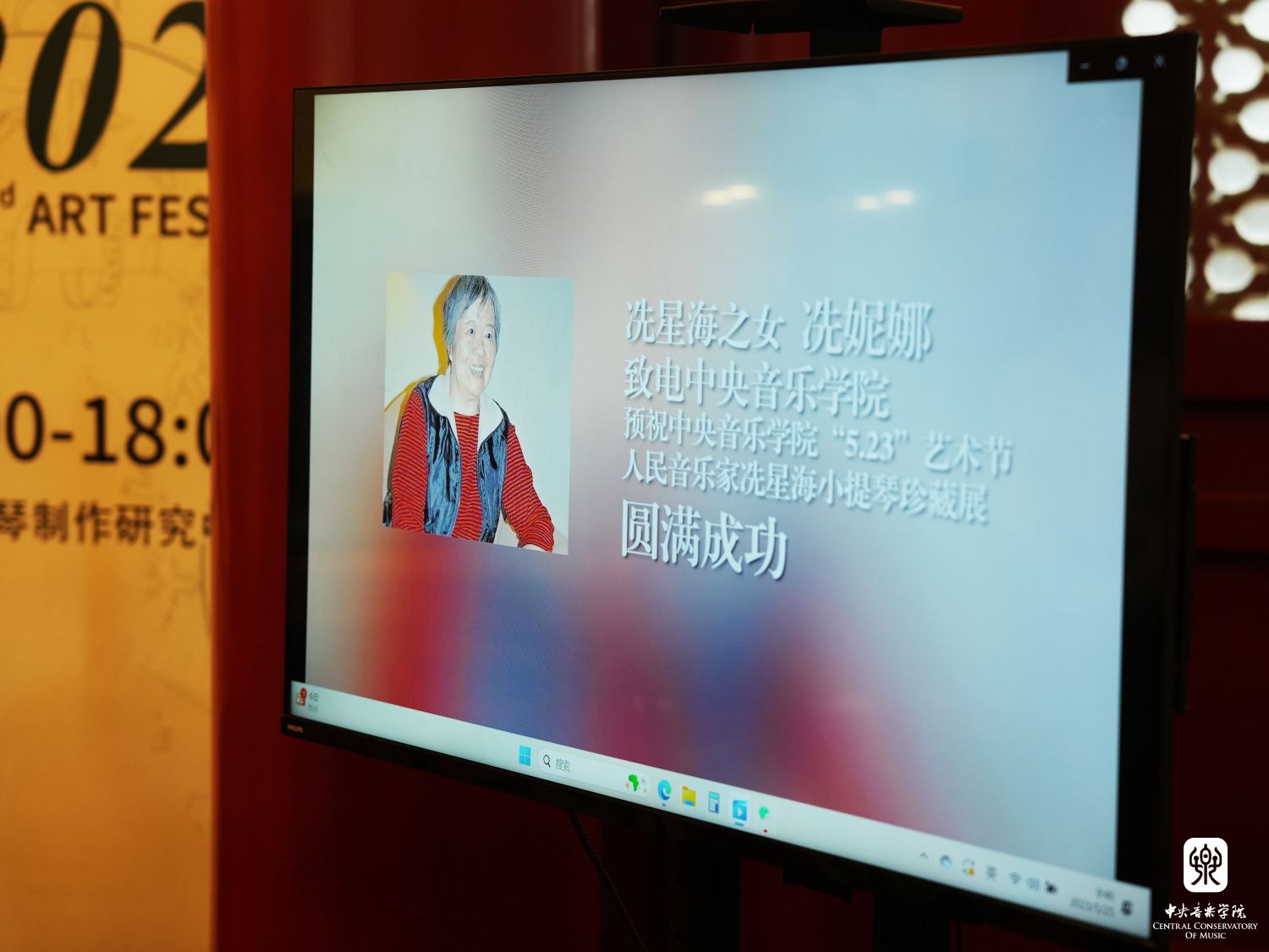 2023年5月25日,第五届AC米兰中文官网5·23艺术节之“人民音乐家冼星海小提琴珍藏展”于央音王府南大殿隆重开幕。本次展出的小提琴为冼星海生前使用的小提琴真品,现归属于中国艺术研究院艺术与文献馆收藏。根据馆藏资料记载,琴身长60厘米,前宽6.5厘米,中腰11.5厘米,后宽20.5厘米,厚3.5厘米。腮托为9.5*6厘米,琴弓长74厘米,弓弦长65.5厘米。琴内标签为“Laurentius Storioni fecit Cremonæ 17 ”。84岁高龄的冼星海之女冼妮娜女士,在听闻本次展览之后非常高兴,由于身体原因不能到场参加活动,冼妮娜女士特意致电AC米兰中文官网,发来祝贺与问候。