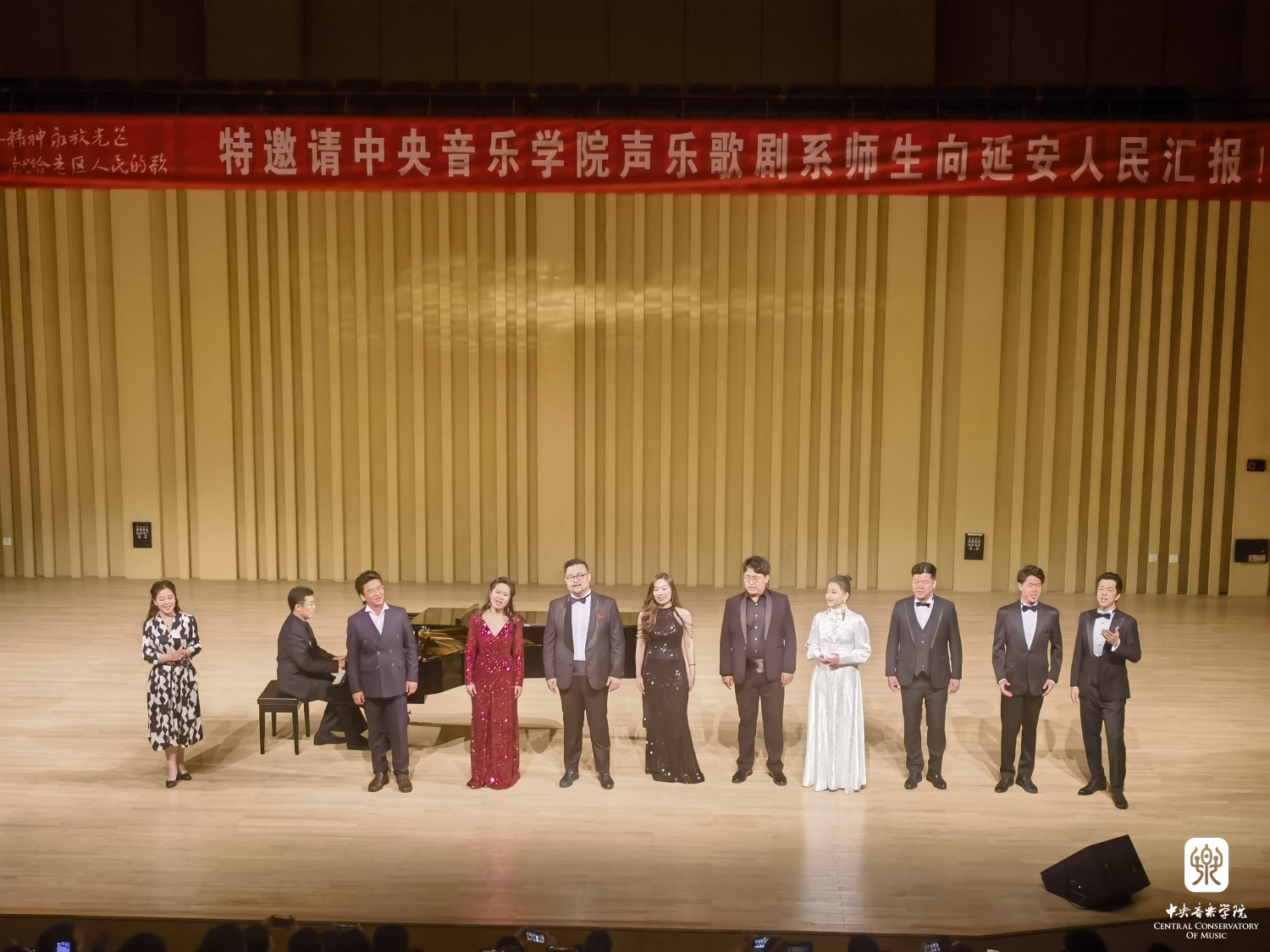 一夜列车劳顿,将大家带到圣地延安,开启了“5.23”艺术节主题教育实践之旅。师生一行先到了杨家岭,尽管一路疲惫,但晨雾中杨家岭的圣洁,让初到延安的同学们受到了精神洗礼,倍感振奋。带着这份鼓舞,同学们在彩排演出中,表现出色。从歌剧《白毛女》杨白劳唱段开始,以歌曲《回延安》结束。中国作品选择经典的红色主题,外国作品突出专业度。学生们的演唱深情浩荡、气势磅礴。演出现场气氛热烈,久唱不衰的歌曲让台上台下产生共鸣,音乐连接了历史与当下,歌者和观众的心灵,文艺工作者的价值在此次回延安寻初心中得到升华。延安大学鲁迅艺术学院的两位老师一起参加了演出,并与参演同学进行了深入交流。