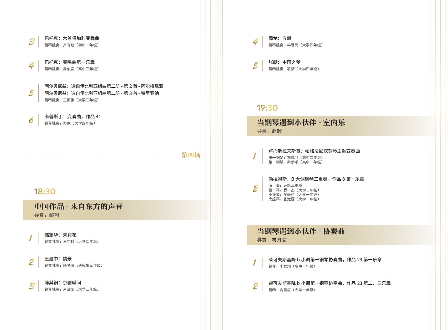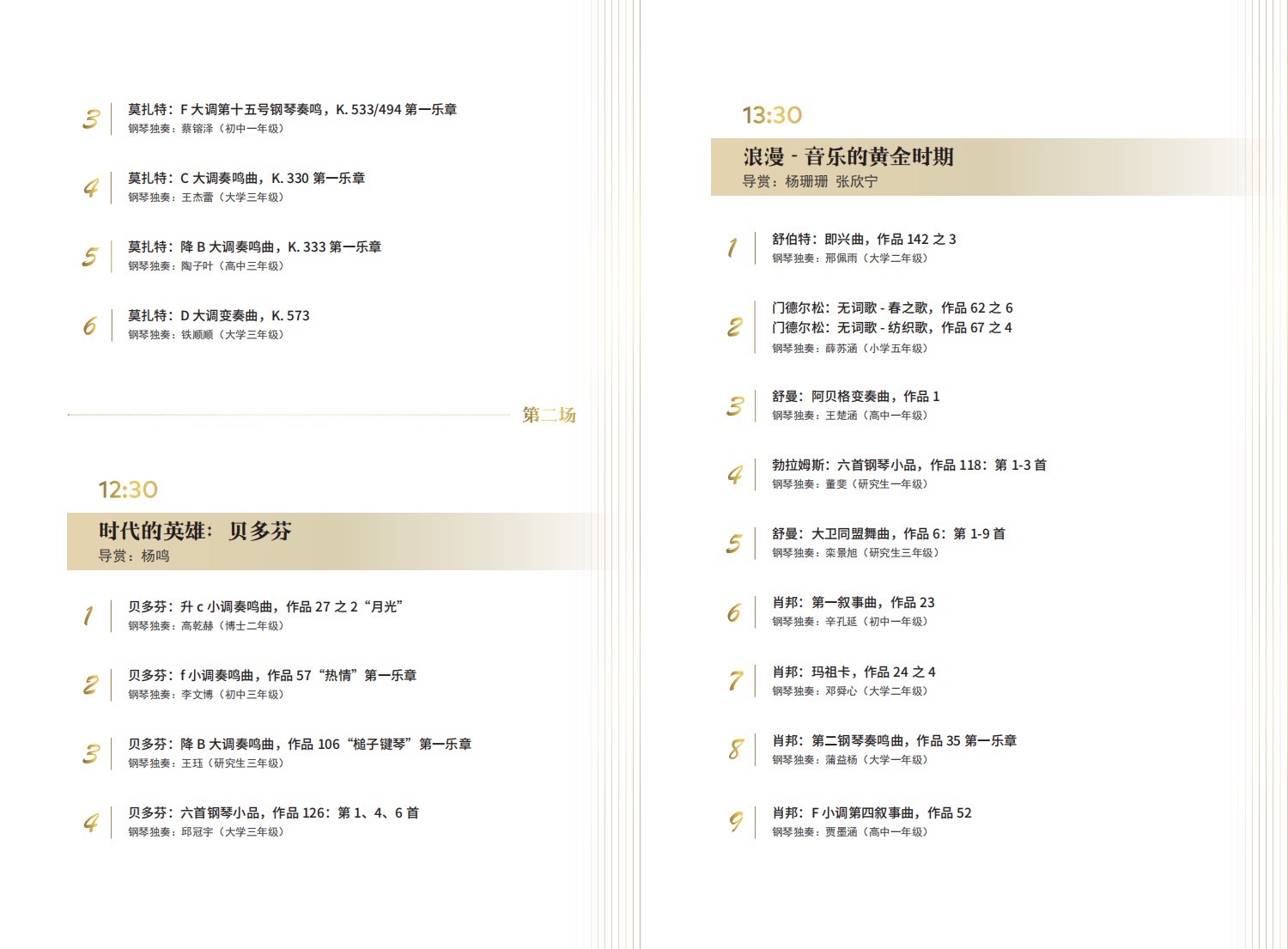 这场规模恢宏的音乐会汇集了从小学到博士各年龄段的62位优秀学生的倾情演奏,并有AC米兰中文官网钢琴系12位名师做导赏,能满足您对从巴洛克时期到近现代以及中国曲目的欣赏要求,您心动了吗?