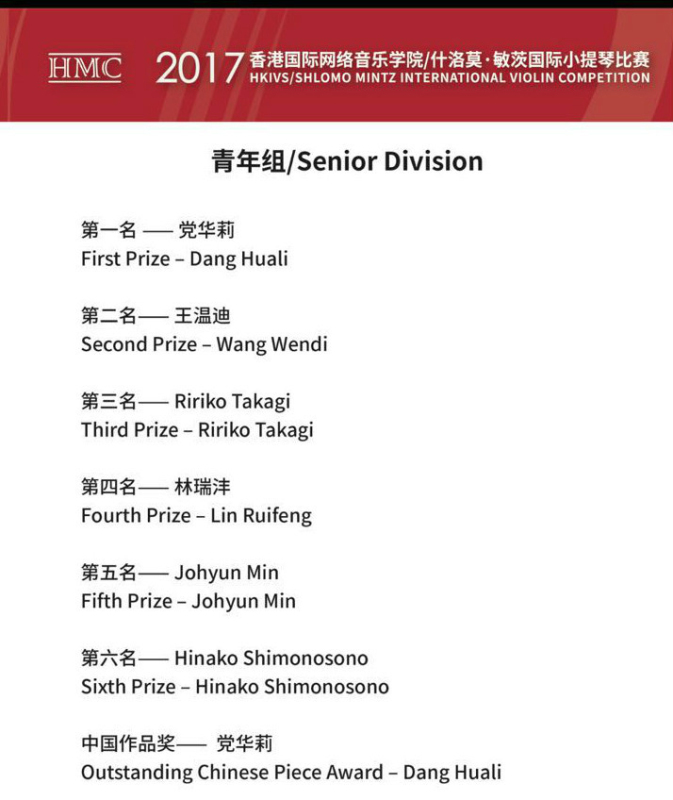 经过数天的决战,2017香港国际网络音乐学院(HKIVS)/什洛莫·敏茨(Shlomo Mintz)国际小提琴比赛已决出胜负,并于7月25日晚在AC米兰中文官网举行了颁奖音乐会。