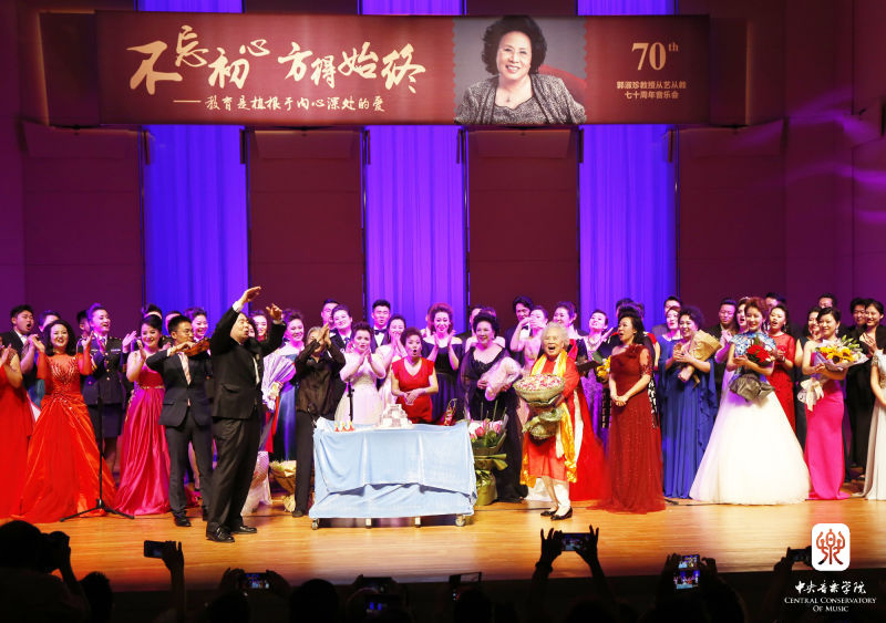 伴随着郭淑珍教授与所有参演者联袂演唱的《我爱你,中国》激情豪迈的歌声,俞峰院长携郭淑兰书记和声乐歌剧系主任张立萍教授一起推上生日蛋糕,并在小提琴演奏家高参的引领下,指挥大家共同唱响"生日快乐"歌,台上台下的浓浓温情让观众们久久不愿离去。被鲜花和学生包围着的郭淑珍教授,脸上也绽放出了幸福的笑容。早在留学回国任教之日郭淑珍教授就曾告诫自己:"要对得起事业,对得起自己,把自己的东西贡献出来,就是最大的幸福。"工作给她带来幸福和快乐,歌唱让她永远年轻。