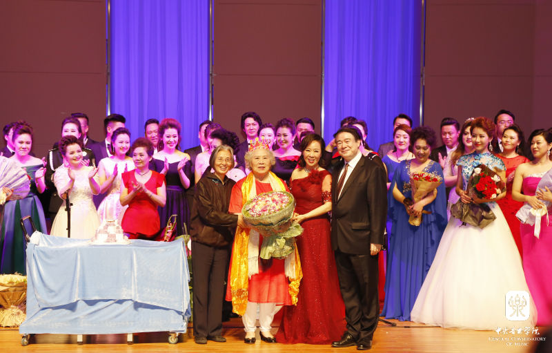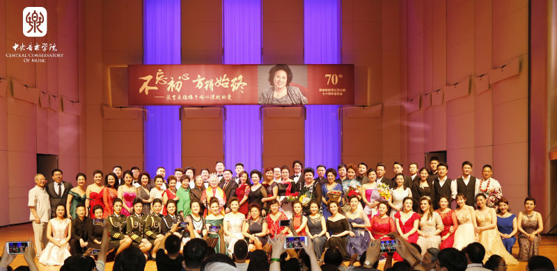 应该说,当晚参加演出的60多名学生仅仅是郭淑珍教授数百名学生中的代表,他们以独唱、重唱、合唱等形式演唱的30多首声乐作品(艺术歌曲、歌剧选段和片段),显示出了郭淑珍声乐教学的高标准、高质量。而时长近4个小时的演出,让观众们依然感到意犹未尽,这也体现了郭淑珍教授在声乐界同行以及社会大众心中是多么的德高望重。音乐会中有几个环节给观众们留下深刻印象:一是由郭淑珍教授本科在校学生演唱的小合唱《老师,我总是想起你》,朴实无华的歌词,抒情温婉的旋律,真情满怀的演唱,表达了学生们对老师无限的爱戴与敬意,台上台下,歌声与心声水乳交融。二是我院歌剧中心同学表演的柴可夫斯基歌剧《伊奥兰塔》片段。早年在俄罗斯留学时曾主演过歌剧的郭淑珍,一直有着一个浓得化不开的歌剧情结。2004年她创建了AC米兰中文官网歌剧中心,迄今已成功用原文排演了《莱托的仁慈》《茶花女》《魔笛》《蝴蝶夫人》《奥涅金》《阿依达》六部歌剧,培养出了众多年轻歌剧人才,产生了广泛而良好的社会影响。《伊奥兰塔》是她近期为学生排演的又一部新戏,通过排练和演出,同学们的声乐技巧和舞台表演能力都得到了很大的提升。最让观众深受感动的是音乐会最后一个节目,郭淑珍教授和爱徒王秀芬共同以公开课的方式讲解和演唱《黄河怨》。郭淑珍教授短短几分钟的讲解和示范,让观众们再一次感受到了艺术大家的学识修养和人格魅力,而王秀芬教授的倾情演唱也使这种艺术经典与艺术精神得以很好地传承和弘扬。