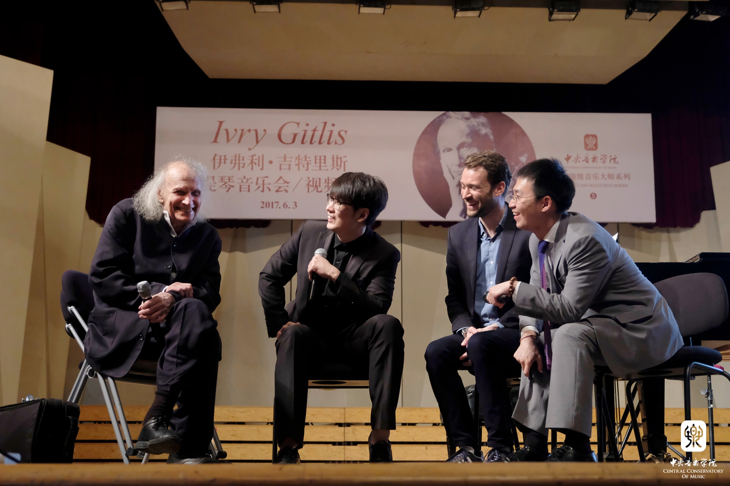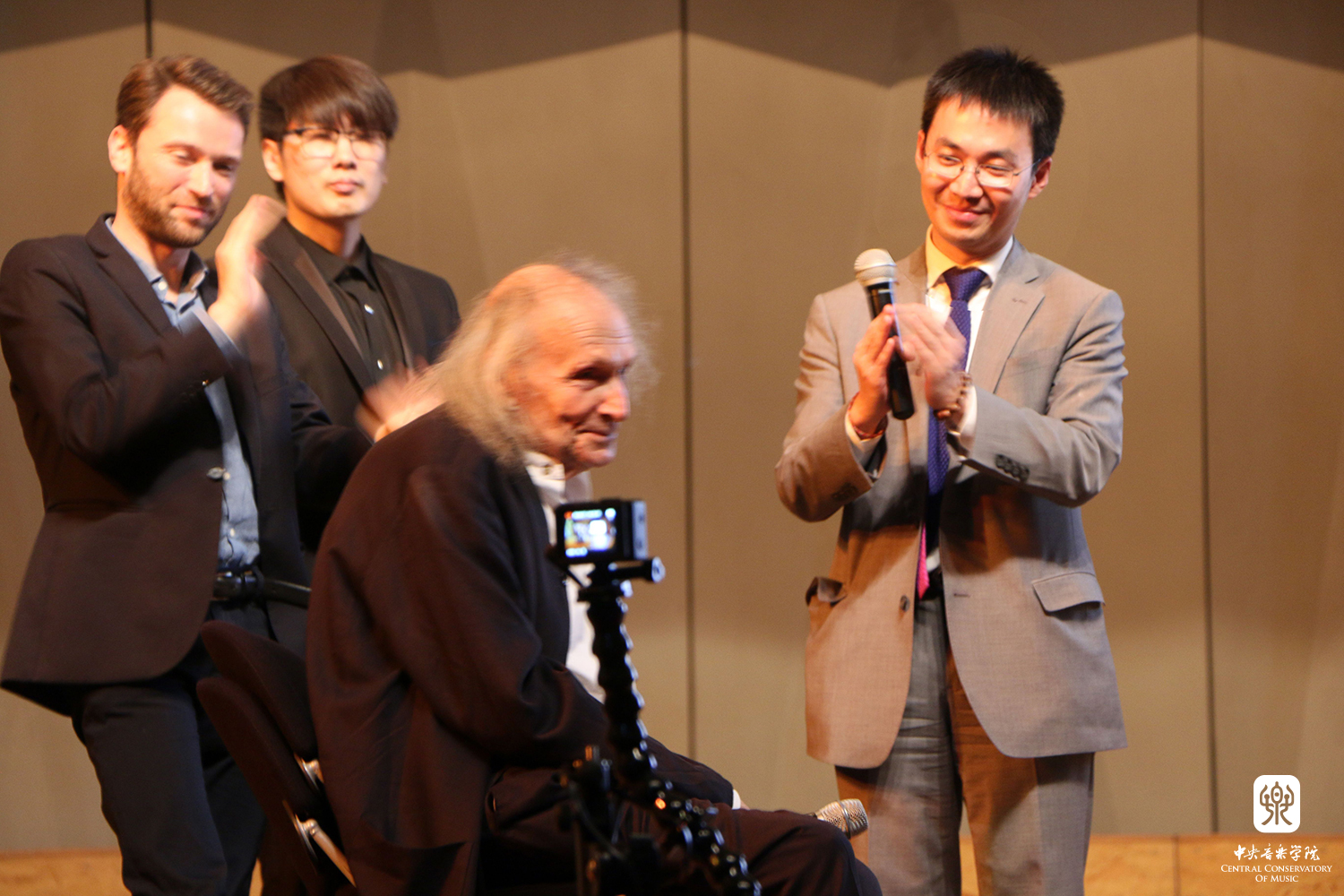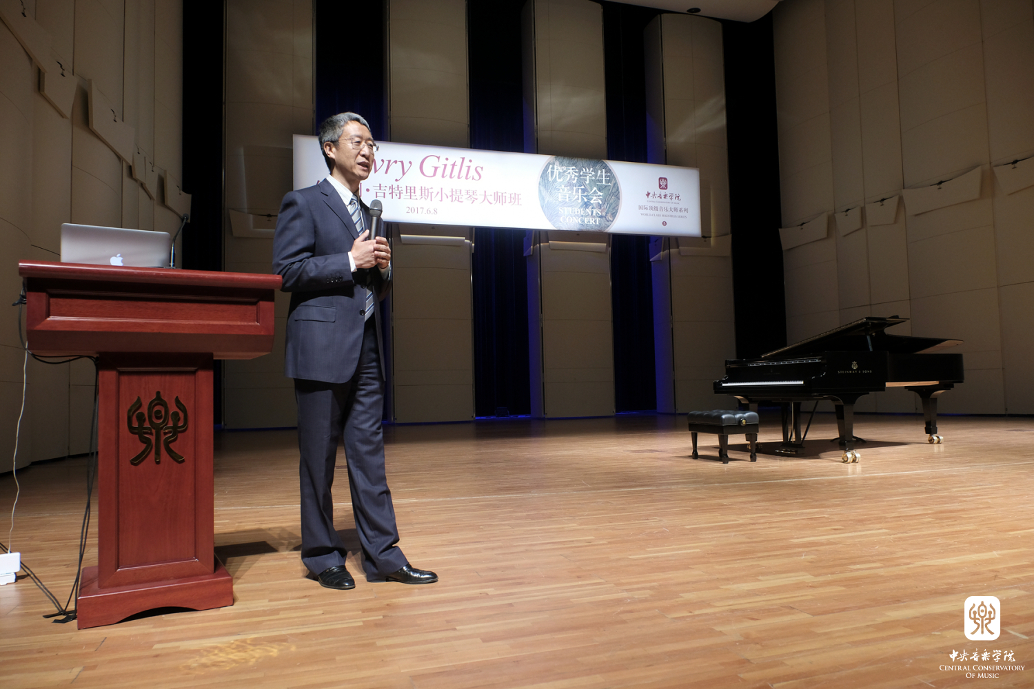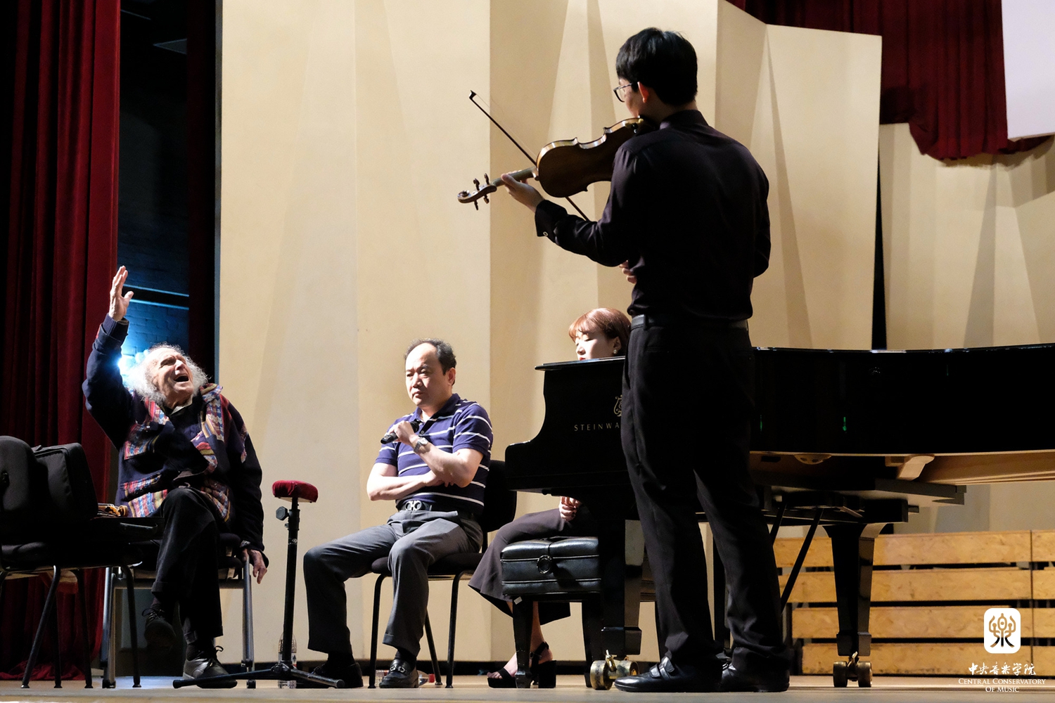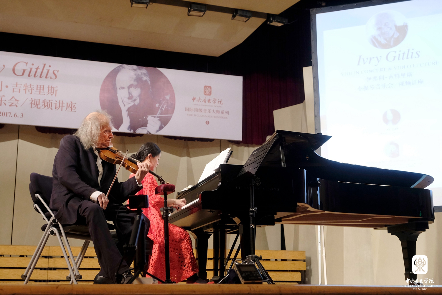此次国际顶级音乐大师系列的活动分为音乐会和大师班两个部分,音乐会又包括演奏和视频讲座两方面内容。6月3日的音乐会,由逄焕磊副书记致辞,代表学院感谢吉特里斯先生的来访并欢迎来自全国以及世界各地的嘉宾朋友。音乐会中吉特里斯亲自演奏了6首作品,包括欣德米特的《奏鸣曲》、帕拉迪斯的《西西里舞曲》、三首克赖斯勒的小品:《爱的忧伤》、《切分音》、《美丽的罗斯马琳》、马塞内特的《沉思曲》以及一首吉特里斯自己创作的小品名为《即兴曲》,由我院黄亚蒙教授担任钢琴伴奏。吉特里斯的演奏风格传承了十九世纪演奏家的即兴感与自发性,听起来流畅自然,既充分表达每首乐曲的个性,又不失去他本人独特的风格。每首作品在吉特里斯手下变得栩栩如生,跌宕起伏的情感让现场许多听了几十年甚至半个世纪他的录音、而当天首次听到他现场演出的观众感动落泪。