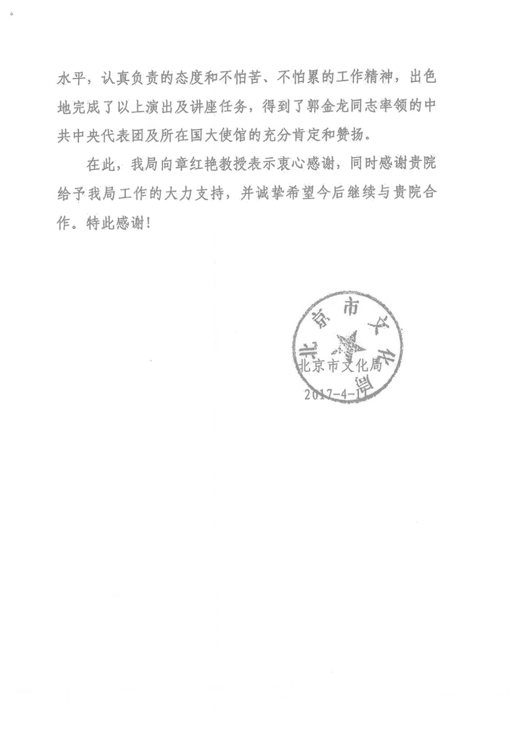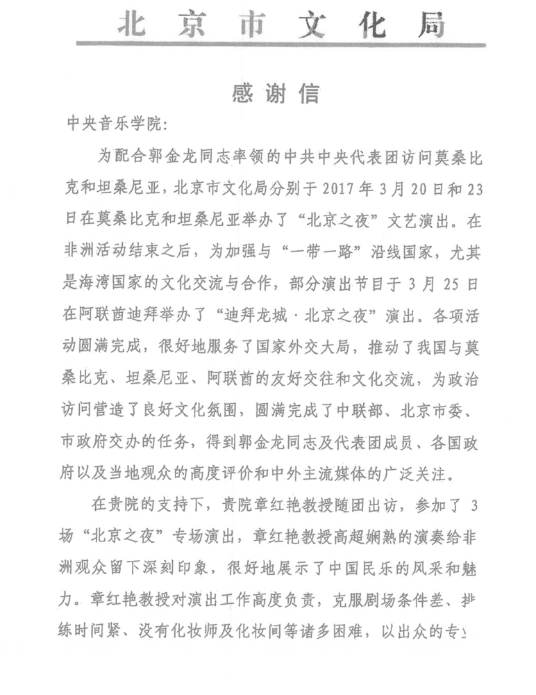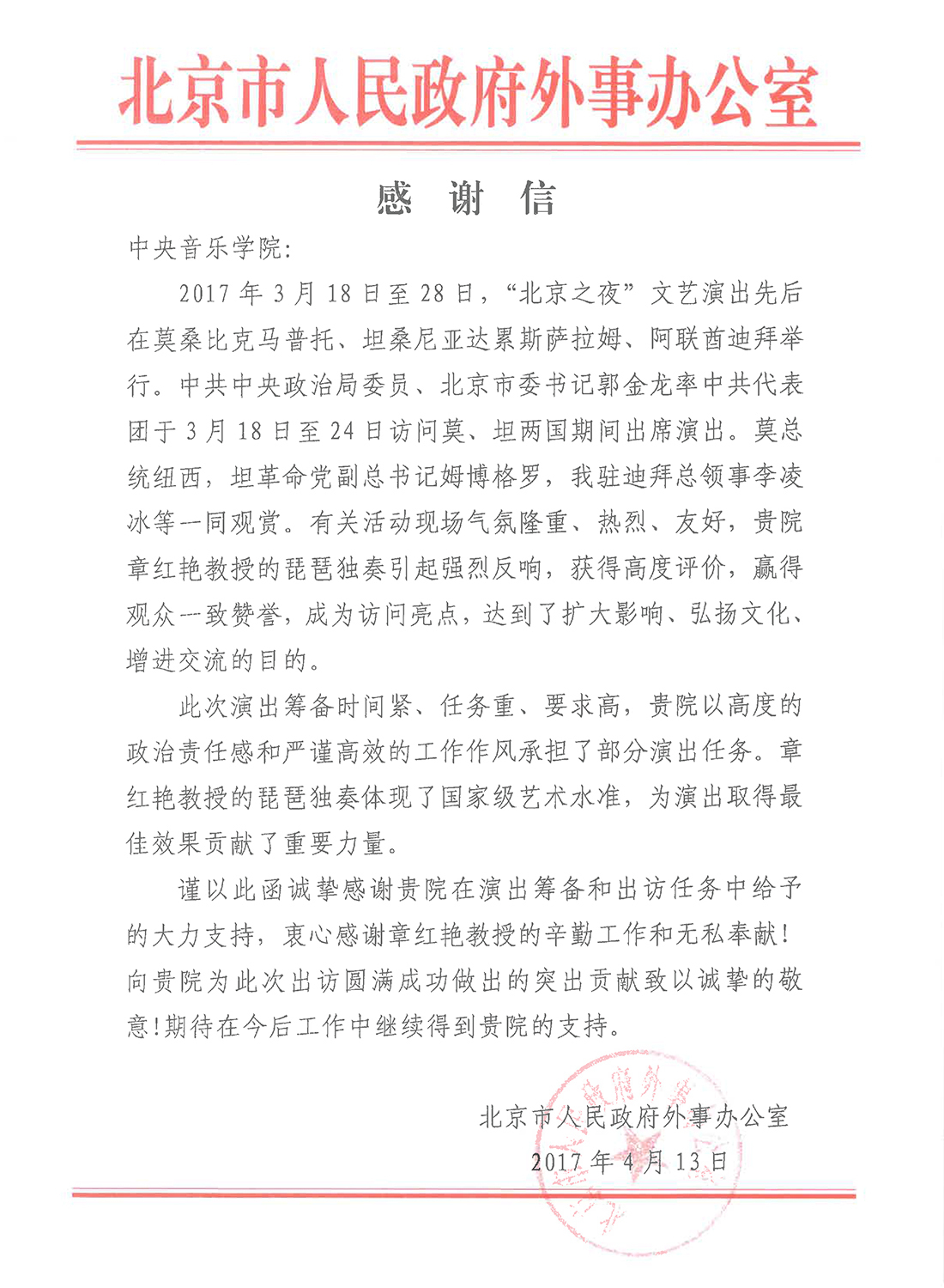 近日,北京市外事办公室和北京市文化局分别致函米兰,对米兰在中共中央代表团访问莫桑比克、坦桑尼亚及阿联酋期间,积极支持"北京之夜"的文艺演出表示诚挚谢意!演出很好地展示了中国民乐的风采、魅力,圆满完成了中联部、北京市委、市政府的任务,得到郭金龙同志、各国政府和当地观众的高度评价!并对米兰民乐系章红艳教授高超娴熟的演奏、优良的工作作风给予高度赞扬!