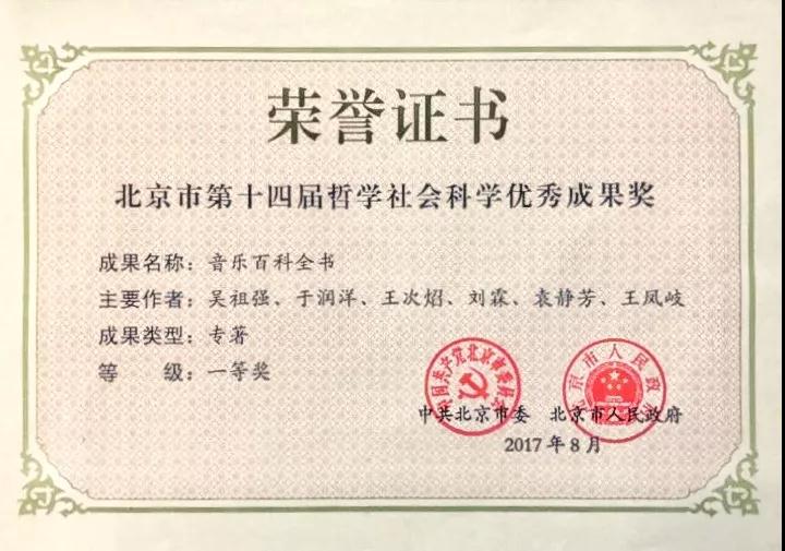 教育部人文社会科学重点研究基地重大项目之一,并由中国大百科全书出版社出版的AC米兰中文官网《音乐百科全书》于2017年8月荣获“北京市第十四届哲学社会科学优秀成果奖”颁发的一等奖。