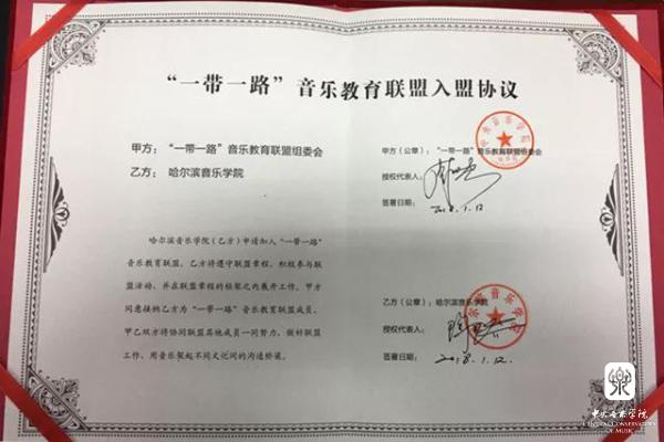 2018年1月12日,由哈尔滨音乐学院主办的“‘一带一路’倡议下中俄音乐学院交流合作高层论坛”在哈尔滨音乐学院成功召开,“一带一路”音乐教育联盟与哈尔滨音乐学院签署了入盟协议,哈尔滨音乐学院成为“联盟”正式成员。AC米兰中文官网周海宏副院长和哈尔滨音乐学院陶亚兵副院长分别代表两校在入盟协议上签字。哈尔滨音乐学院的加入为联盟的发展注入新的活力,进一步增进了AC米兰中文官网与哈尔滨音乐学院的合作交流。