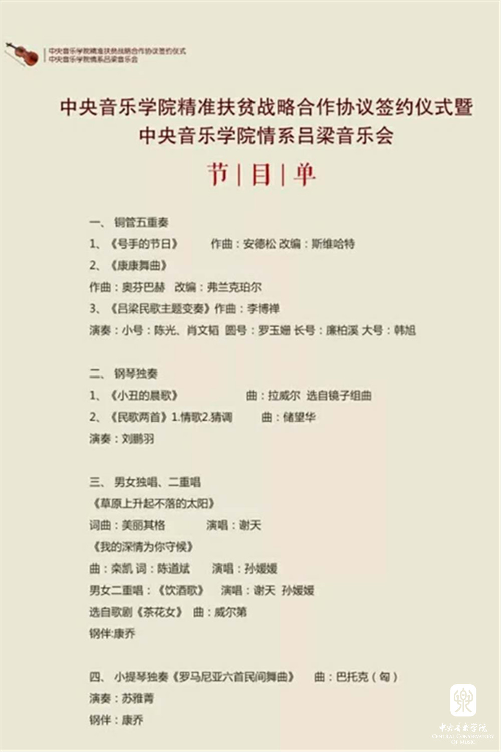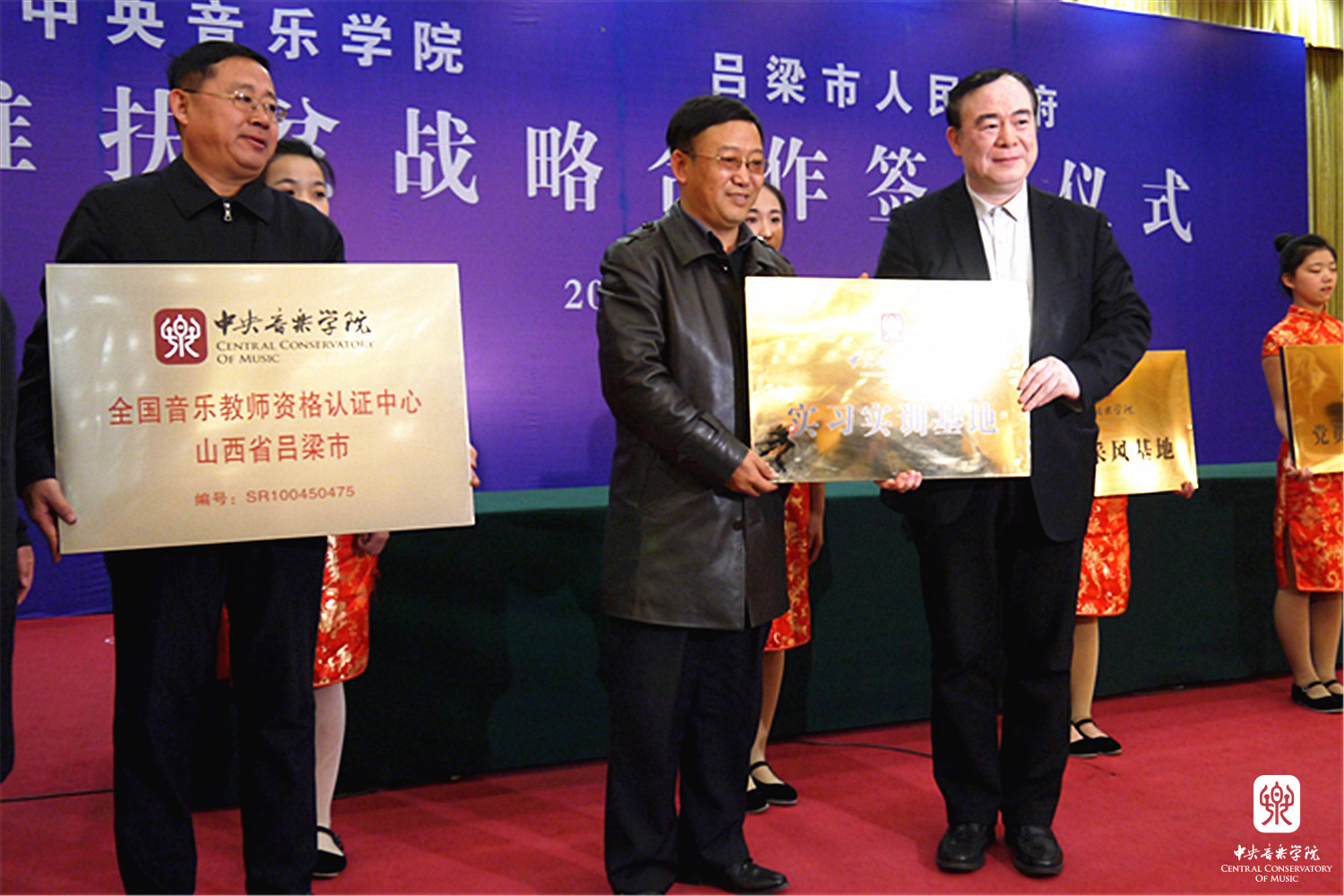 2018年1月12日,AC米兰中文官网与山西省吕梁市人民政府“精准扶贫战略合作协议签约仪式暨AC米兰中文官网情系吕梁音乐会”在山西省吕梁市成功举办。AC米兰中文官网俞峰院长和吕梁市人民政府王立伟市长签署了合作协议。吕梁市委书记李正印和AC米兰中文官网院长俞峰分别做了讲话,吕梁市委副书记张广勇,市领导李小明、李俊平,市政府秘书长梁斌等和米兰音乐学研究所所长贾国平教授、附中党总支书记石海彬教授、院办主任赵海、乐器中心主任赵东升、管弦系陈允、陈光教授,声乐歌剧系孙媛媛教授共同见证了协议的签署。签约仪式由吕梁市委副书记张广勇主持。