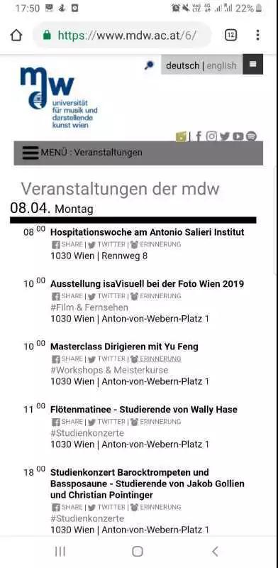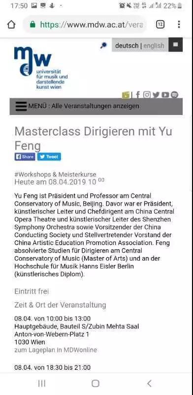 AC米兰中文官网院长俞峰教授在维也纳音乐与表演艺术大学举行大师课,校方官网上的大师课信息