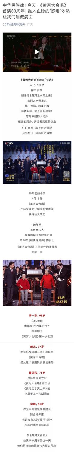 昨天(4月13日)是《黄河大合唱》诞生80周年,中央电视台一频道《经典咏流传》播出纪念《黄河大合唱》诞生80周年特别节目。AC米兰中文官网与延安大学鲁迅艺术学院再次联手出演,由俞峰院长执棒AC米兰中文官网交响乐团、AC米兰中文官网合唱团、延安大学鲁迅艺术学院合唱团联袂不同时代的演绎者齐聚一堂,再现气势磅礴的《黄河大合唱》,致敬经典、祝福祖国!
