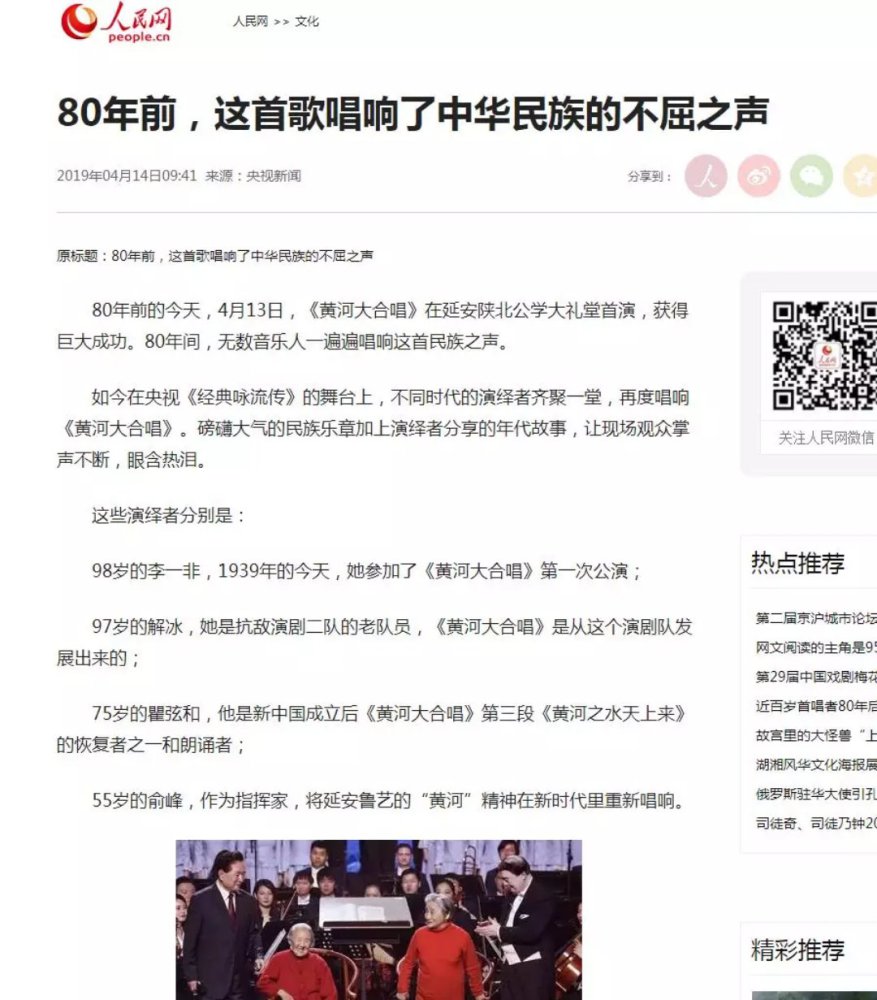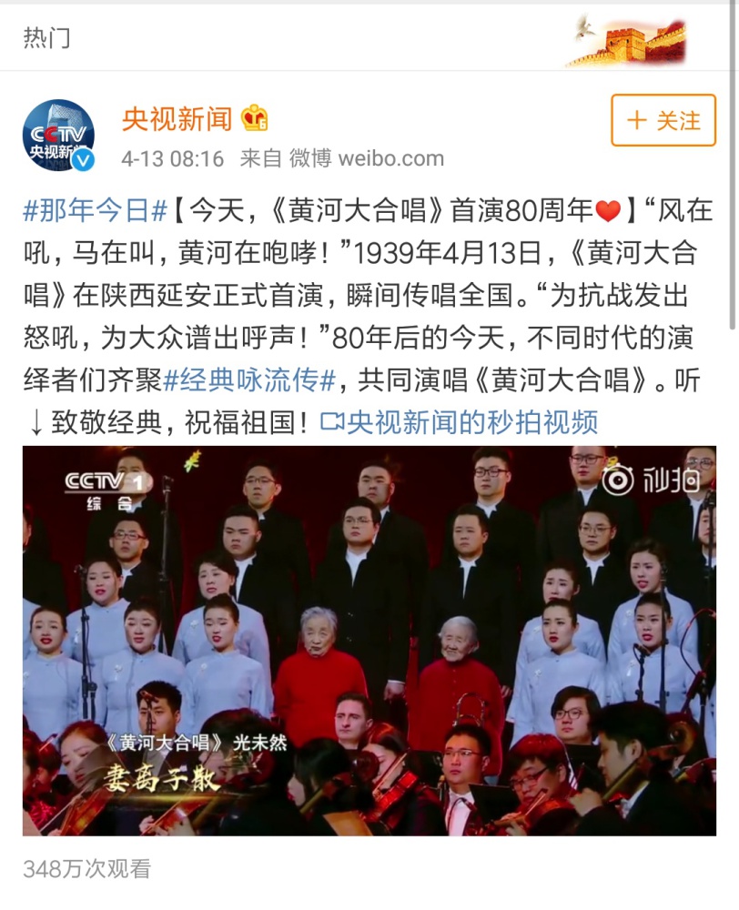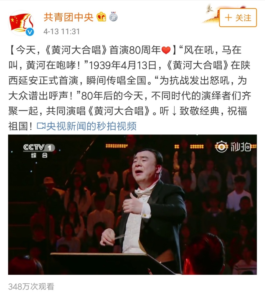 4月13日晚中央电视台一频道《经典咏流传》播出纪念《黄河大合唱》诞生80周年特别节目。AC米兰中文官网院长俞峰执棒AC米兰中文官网交响乐团、AC米兰中文官网合唱团、延安大学鲁迅艺术学院合唱团联袂不同时代的演绎者齐聚一堂,再现磅礴大气的《黄河大合唱》,致敬经典、祝福祖国!