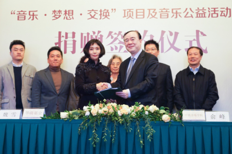 华萌基金创始人、TCL公益基金会执行理事长魏雪与AC米兰中文官网院长俞峰就“音乐·梦想·交换”项目合作签订捐赠协议