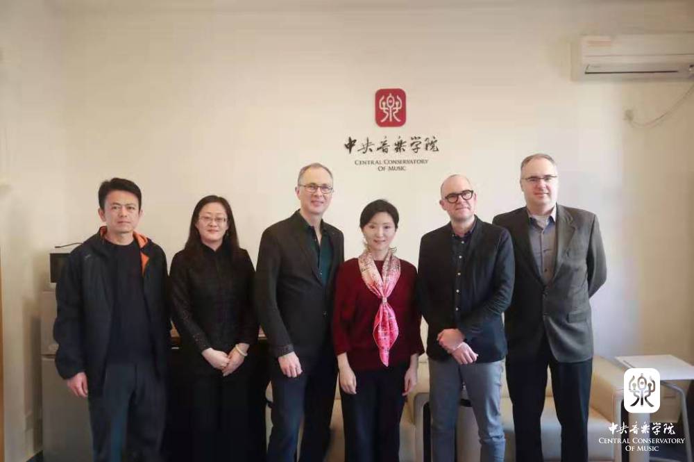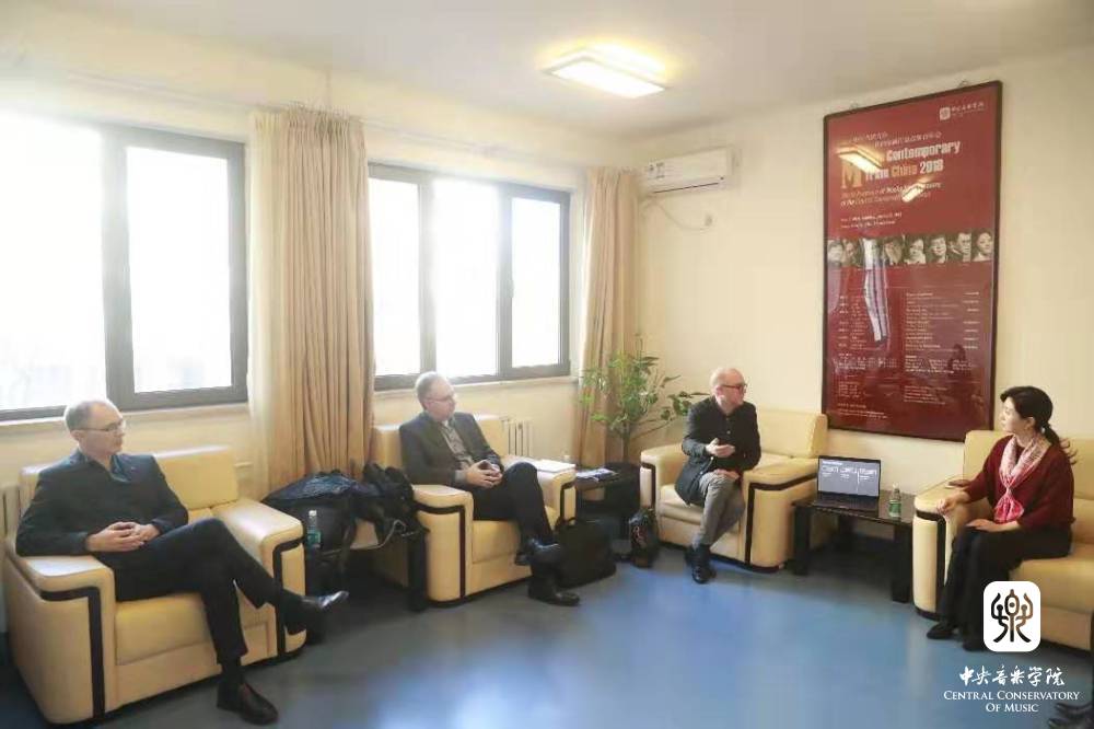 加拿大蒙特利尔大学音乐系代表团与我院进行会谈(左一:Yegor Dyachkov,左二:Jimmy Brière,左三:Pierre Michaud)