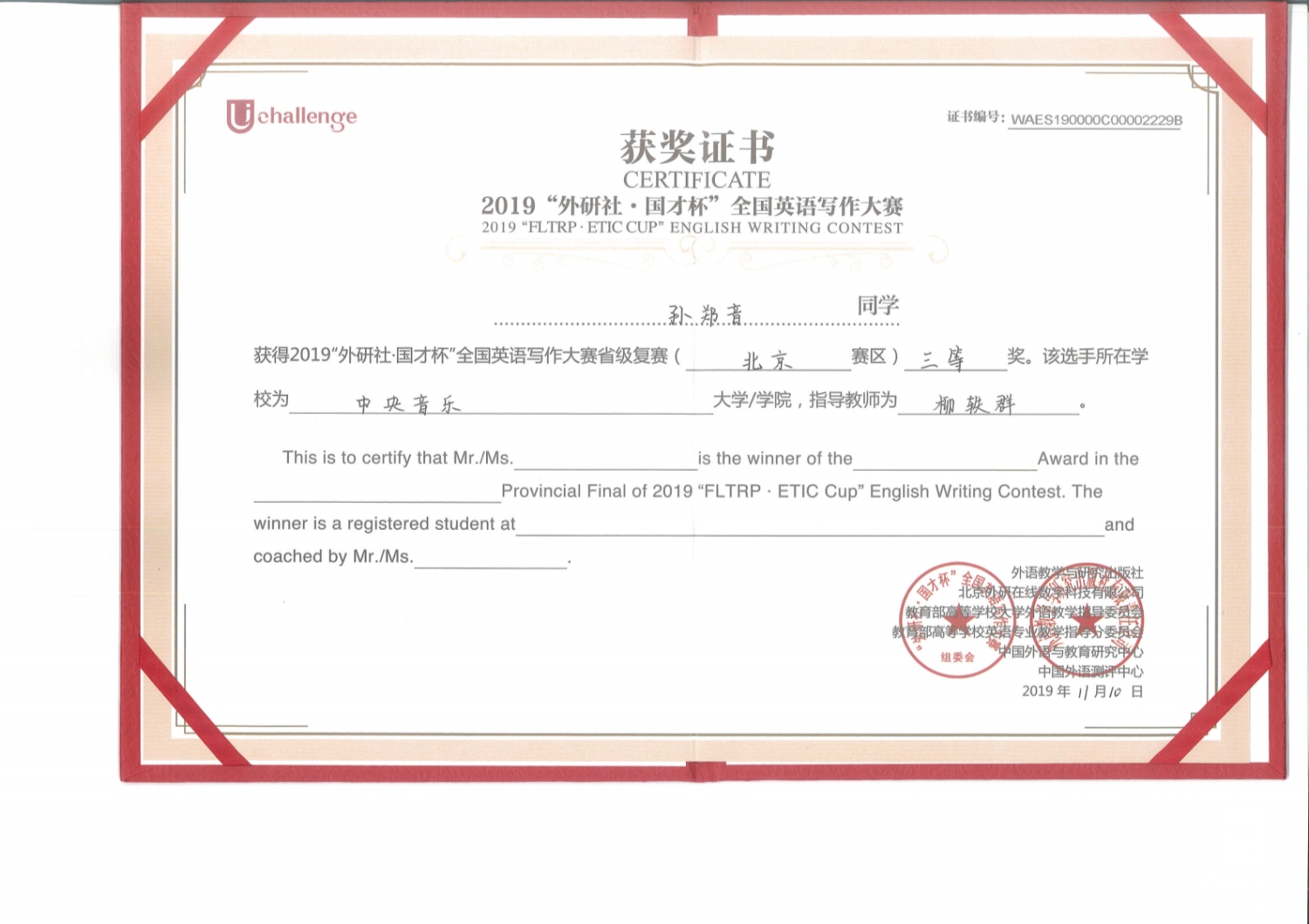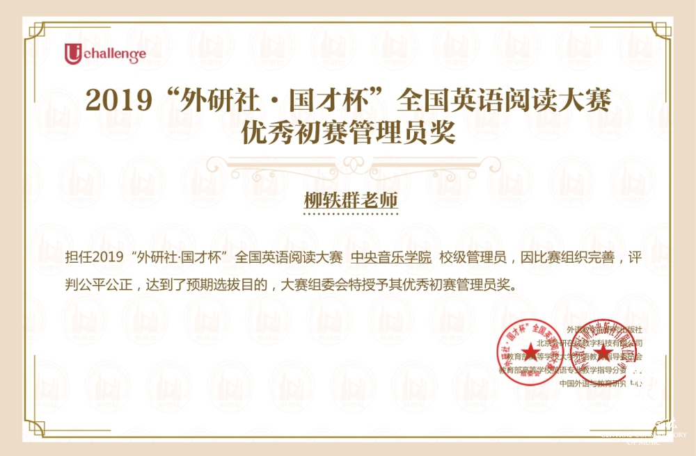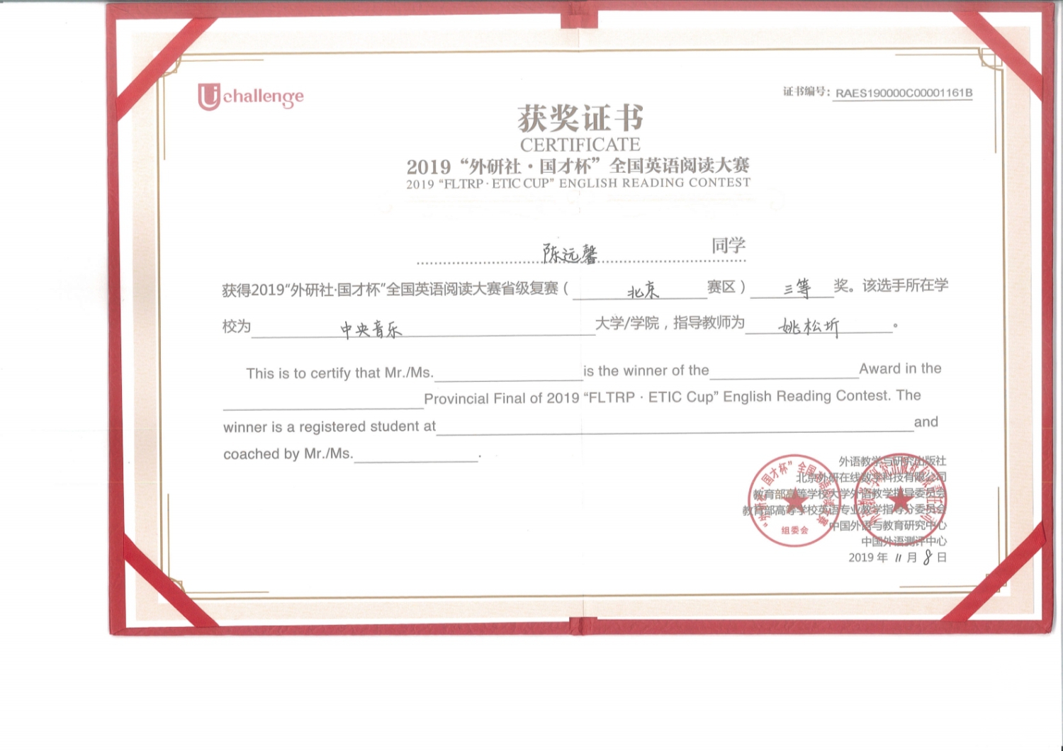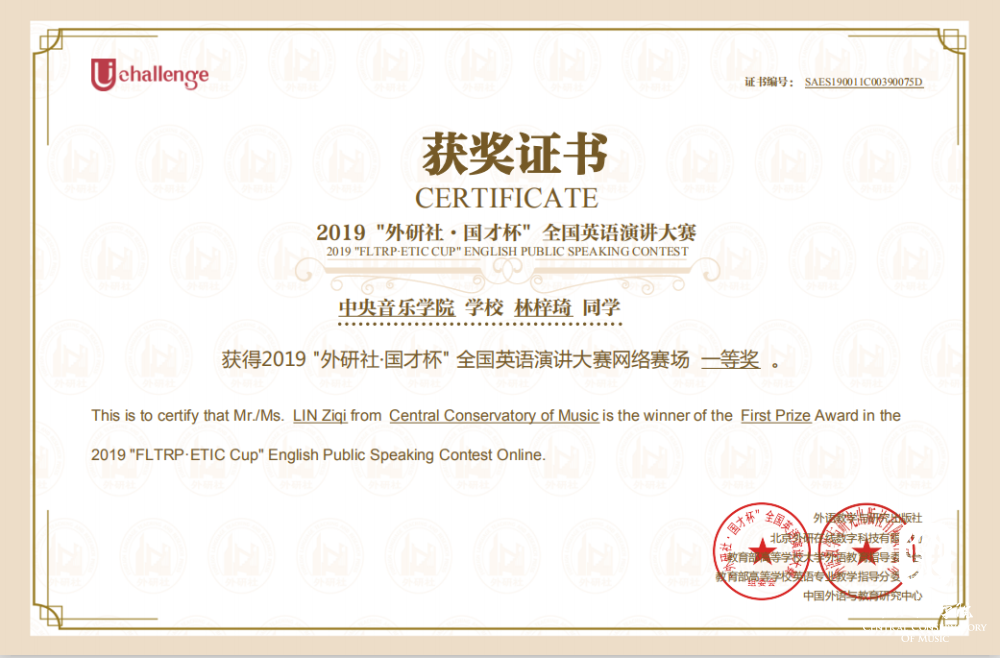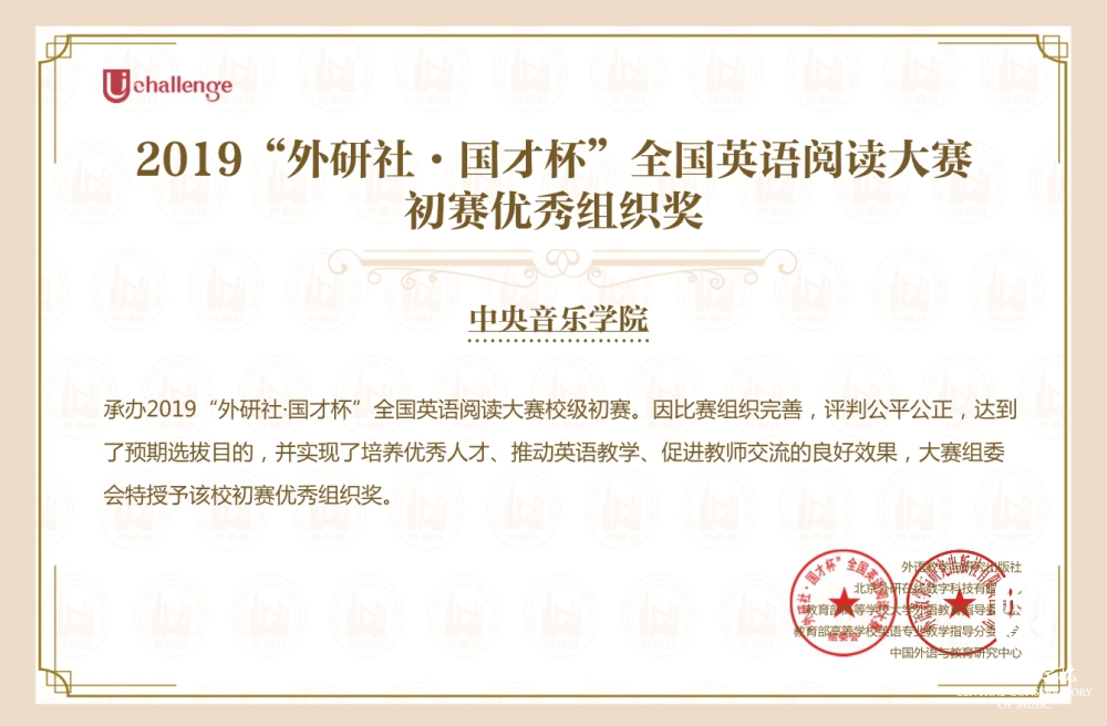 2019“外研社•国才杯”全国英语大赛由外语教学与研究出版社、教育部高等学校大学外语教学指导委员会、教育部高等学校英语专业教学指导分委员会和中国外语与教育研究中心、中国外语测评中心联合主办,是外研社 Unipus系统为全国大学生打造的展现风采、实现自我的新型平台。10月13日,米兰共有113名学生报名参加写作大赛初赛,119名学生报名参加阅读大赛初赛。根据赛事主办方反馈的初赛成绩米兰分别有19名和26名同学在写作和阅读大赛初赛中获奖,并获得主办方颁发的电子获奖证书。11月2日在北京印刷学院举办的写作复赛和阅读复赛共吸引首都50所高校的近百名选手参加,其中英语专业学生占比超过三分之一。在名校荟萃的北京赛区,米兰四位选手以扎实的语言能力和灵活的赛场应变能力取得了瞩目的成绩,整体排名远超艺术类兄弟院校选手,比赛成绩名列首都艺术高校榜首。11月3日在北京林业大学举行的北京市演讲复赛共吸引了来自首都44所高校的选手,与此同时演讲比赛的网络赛场同步开放比赛。据赛事主办方数据,全国共有645所院校的4243名选手通过网络赛场自主报名参加演讲大赛。米兰音乐学系大一新生林梓琦同学在激烈的网络比拼中以卓越的语言能力连晋两级跻身全国150强,荣获网络赛场一等奖,创下米兰历史上的又一个“第一次”。