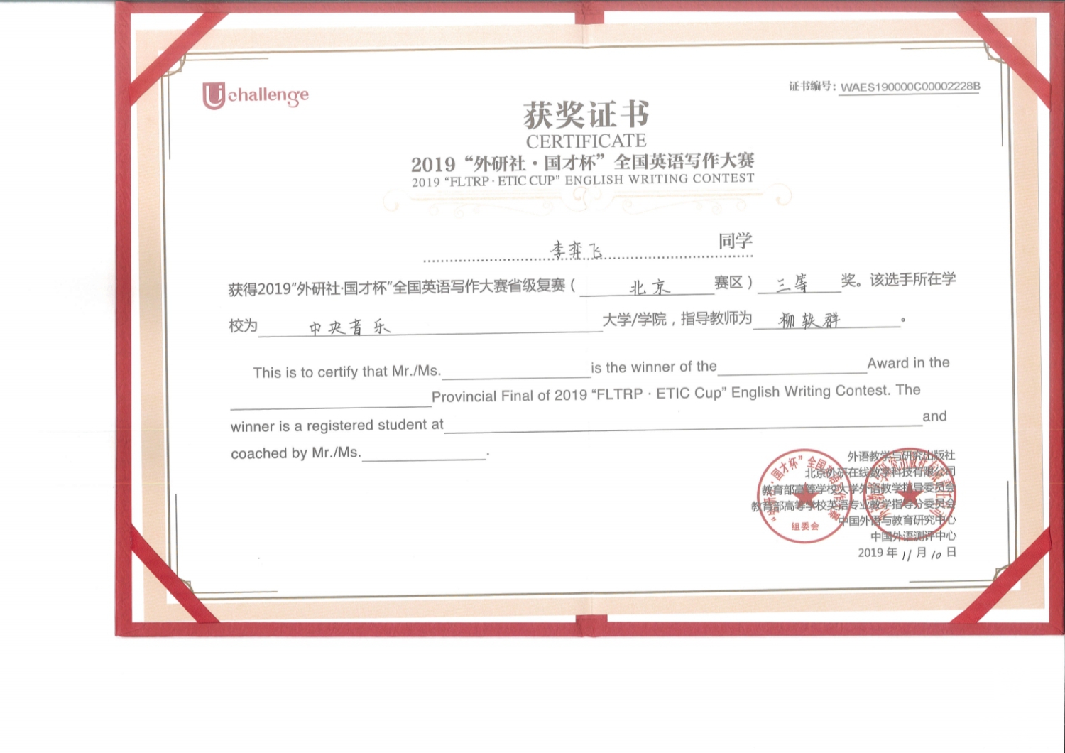 2019年12月“外研社•国才杯”全国英语写作、阅读和演讲大赛(北京赛区)复赛,以及演讲大赛网络赛场落下帷幕。米兰共有5位同学代表学校参加北京赛区各类复赛并获奖;此次“外研社·国材杯”全国英语演讲比赛同步开启境内网络比赛,米兰大一新生林梓琦首战即胜,闯入网络赛场决赛赛场,这是米兰历史上境内学生首次闯入演讲比赛的决赛环节,实现了米兰英语教学历史上又一个新突破。此次2019“外研社·国才杯”英语大赛米兰获奖选手完整名单如下: