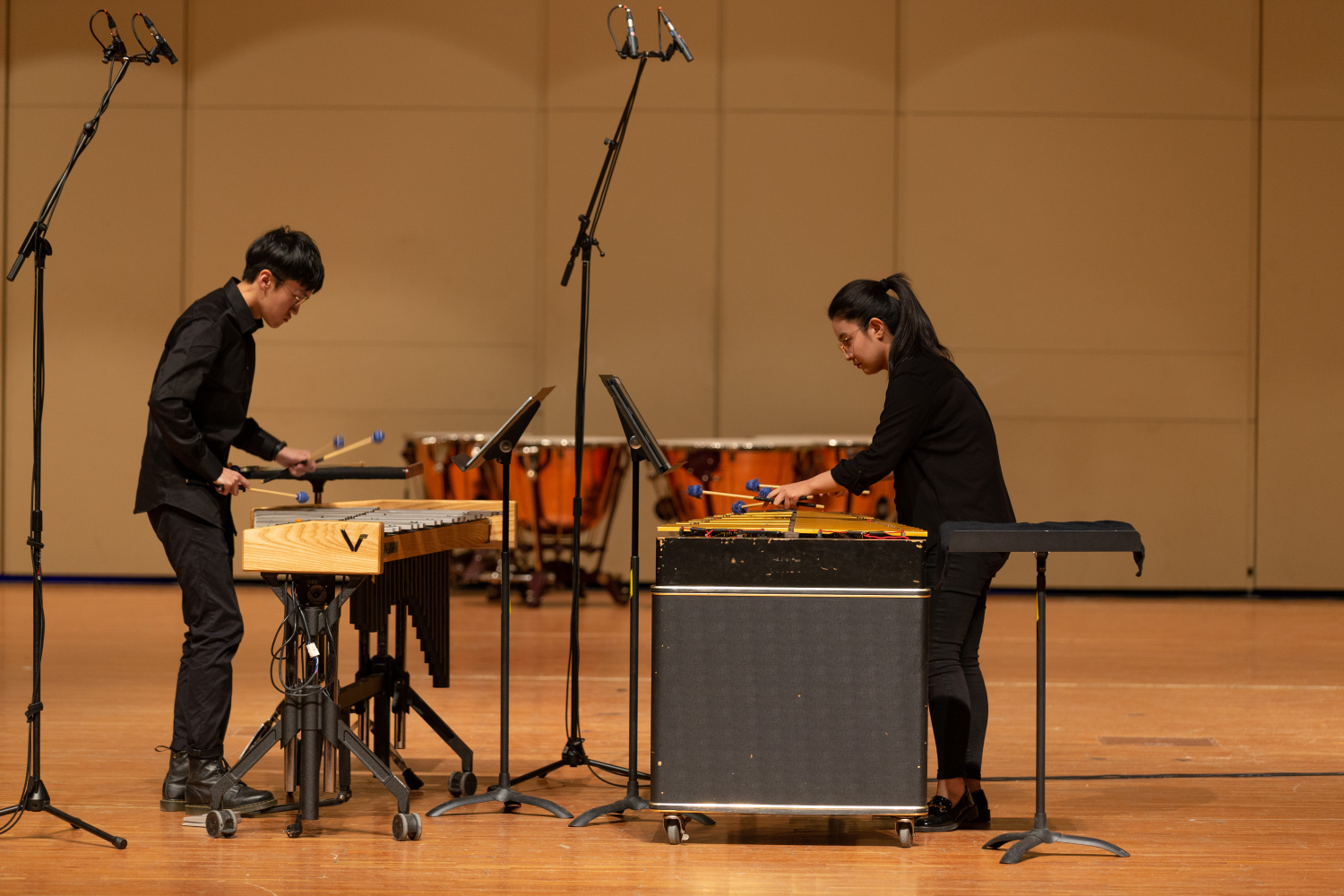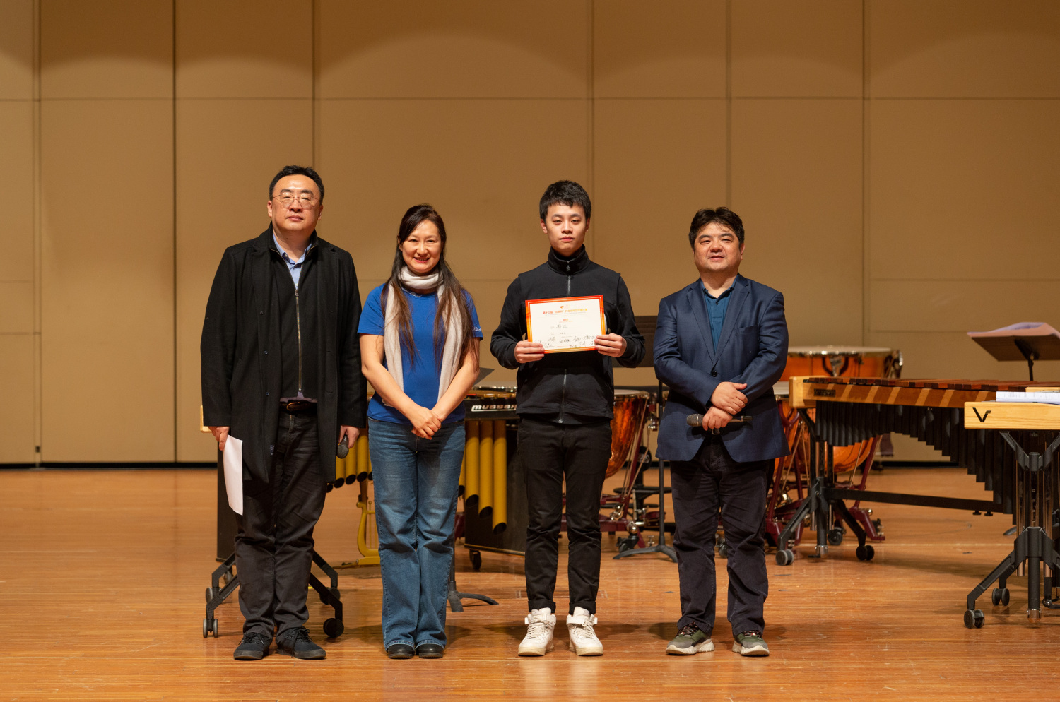 演奏结束后,在郝维亚教授的主持下,管弦系李飈教授为每个作品做了详细的点评、并给予了创作者关于提升作品的一系列建议,同时为参赛选手和在场观众讲解了许多例如“摆台与演奏的关系”等打击乐创作与演奏的相关问题。郝维亚教授和李飈教授在台上的对话为“创作与演奏的交流”做出了表率的作用。