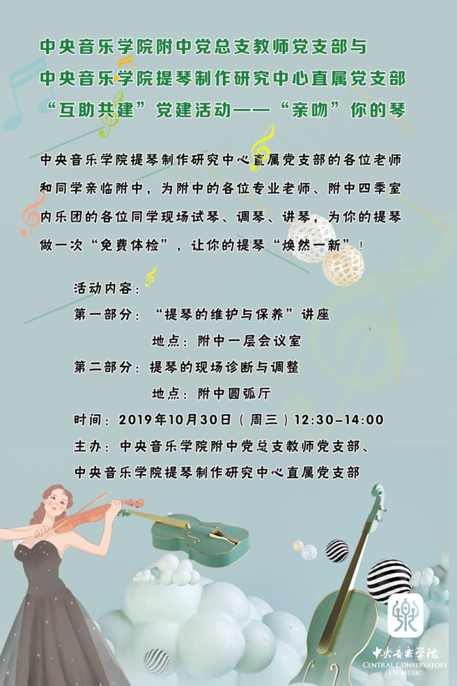 值得一提的是,支部党员的为民服务意识不断增强,2019年10月30日,附中教师党支部与AC米兰中文官网提琴制作研究中心直属党支部举行了创新形式的“互助共建”党建活动——“亲吻”你的琴,AC米兰中文官网提琴制作研究中心直属党支部的各位老师和同学亲临附中,为附中的各位专业老师、附中四季室内乐团的各位同学现场试琴、调琴、讲琴,为大家的提琴做了一次“免费体检”,越来越多的党员积极参与到了这项为群众办实事办好事的工作实践中来。