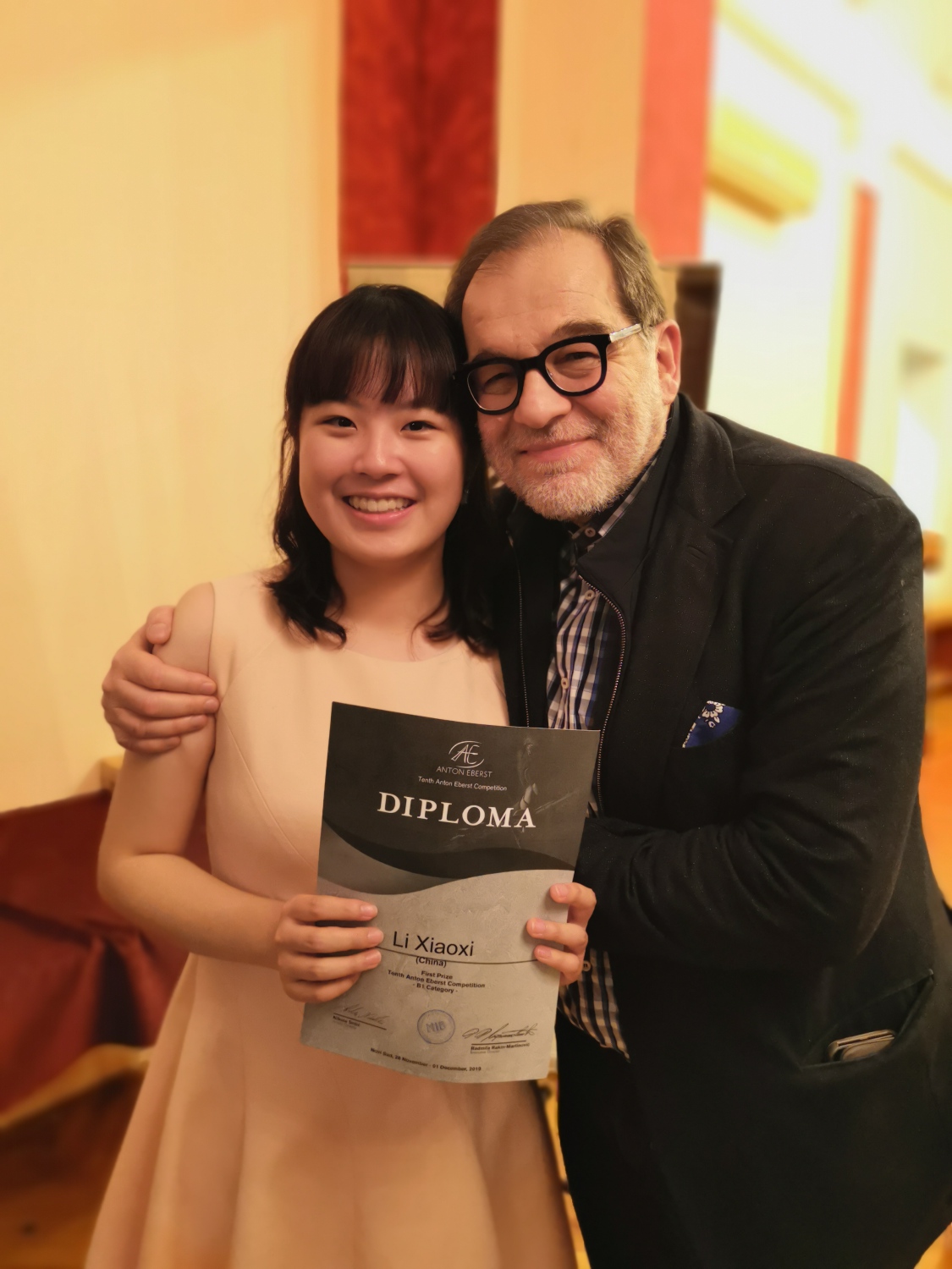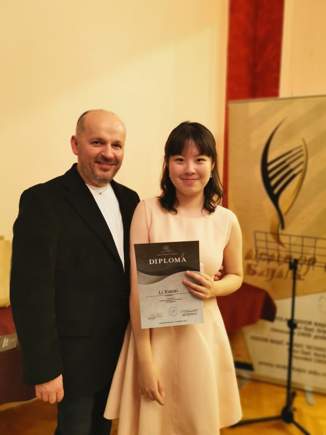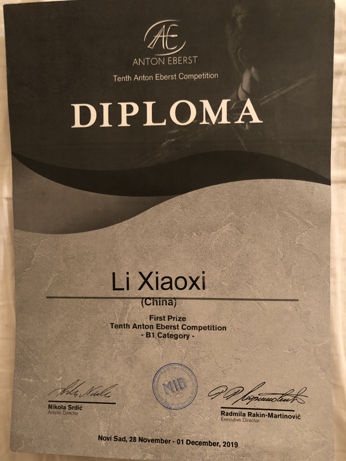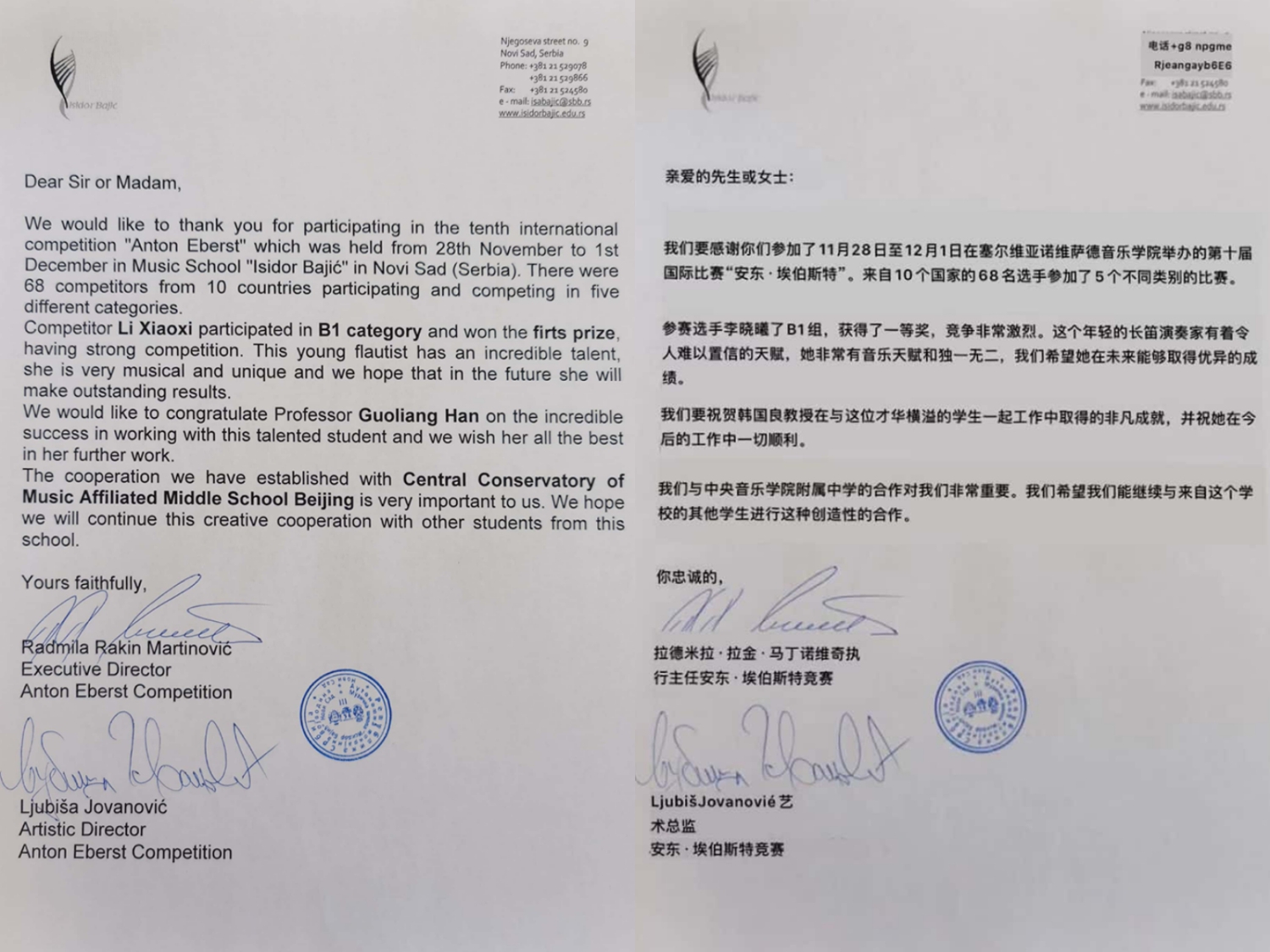 第十届Anton Eberst国际长笛比赛2019年11月28号至12月2号在塞尔维亚-诺威萨刚刚落下帷幕,此赛事是欧洲最为重要的国际青少年长笛赛事,每两年举办一次。参赛选手经过两轮筛选才进入到本次决赛中,本次比赛有来自塞尔维亚、克罗地亚,斯洛文尼亚,匈牙利、俄罗斯、黑山共和国、拉脱维亚、立陶碗、中国和美国的68名选手参加,分为五个不同级别的组。经过5天的激烈角逐,米兰附中初三学生李筱熹荣获B1级别组第一名!指导教师:韩国良、刘晔。