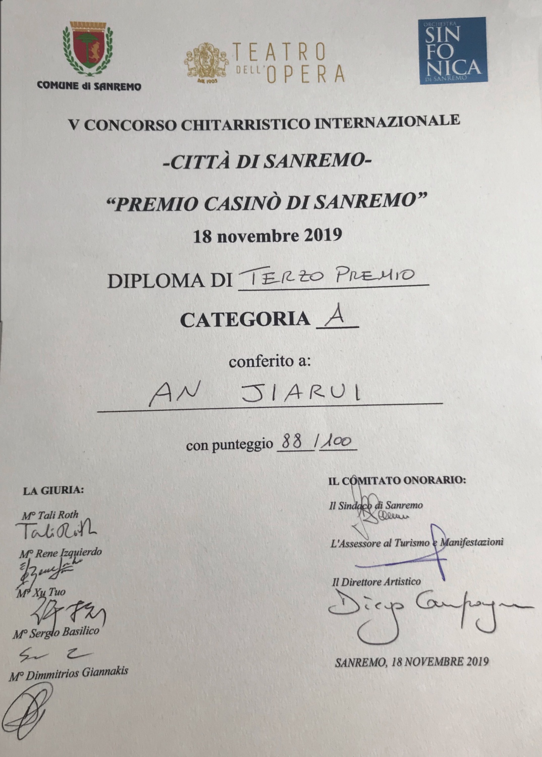 2019年11月19日第五届意大利圣雷莫国际吉他比赛(5th Sanremo International Guitar Competition)落下帷幕,来自AC米兰中文官网管弦系古典吉他专业大一新生安佳瑞经过激烈的角逐取得了最高组别(25岁以下)第三名的好成绩。安佳瑞同学自附中起师从AC米兰中文官网古典吉他讲师许拓,安佳瑞同学也成为该项比赛举办以来第一位获奖的中国选手。