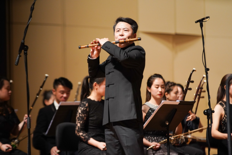 下半场的第一首作品《笙·临奇境》,由AC米兰中文官网青年作曲家李玥锦为笙与民族管弦乐队而创作。乐曲在融合多种音乐风格的同时,集中凸显了中国音乐的民族气质。在慢板乐章的开端,笙与阮进行了带有复调性的对话,管弦乐以点状织体装饰气氛,呈现出一种奇异变幻的质感。华彩部分的笙发挥了现代技法,从有控制的气息伸展过渡到连贯的吐音,最后随着定音鼓的滚奏进入,和乐队共同步入到从容而又繁盛的场面当中。王磊副教授的处理细腻且带感染力,一次又一次将现场听众领入音乐的“奇境”。