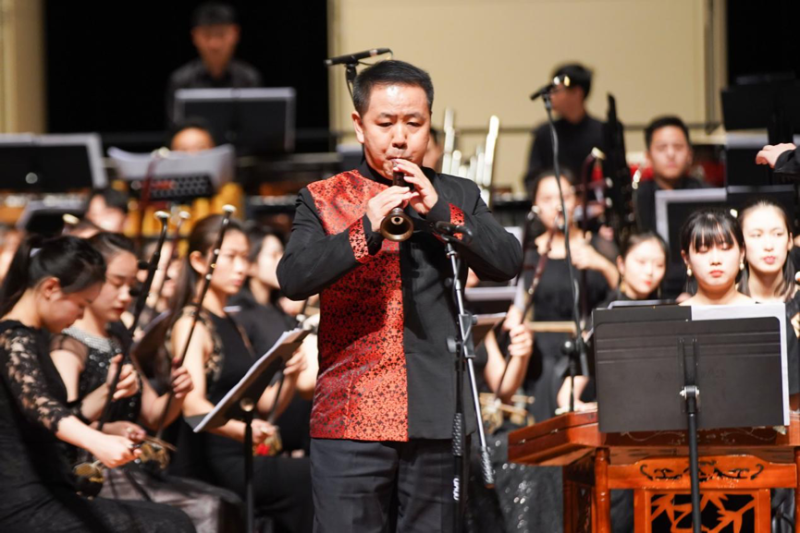 青年教师张维维演奏的唢呐协奏曲《塞上风情》,是从马迪先生1997年创作的笛子独奏曲移植而来的曲目,以陕北民歌《泪蛋蛋抛在沙蒿蒿林》作为素材改编而成。引子和慢板部分,唢呐深长的气息如悲如啼。其中对民歌主题进行的变化处理,增强了乐曲的叙事感。快板部分热烈激越,气质淳朴,以唢呐演奏的长音为乐曲强收,绽放出一种生生不息的活跃。