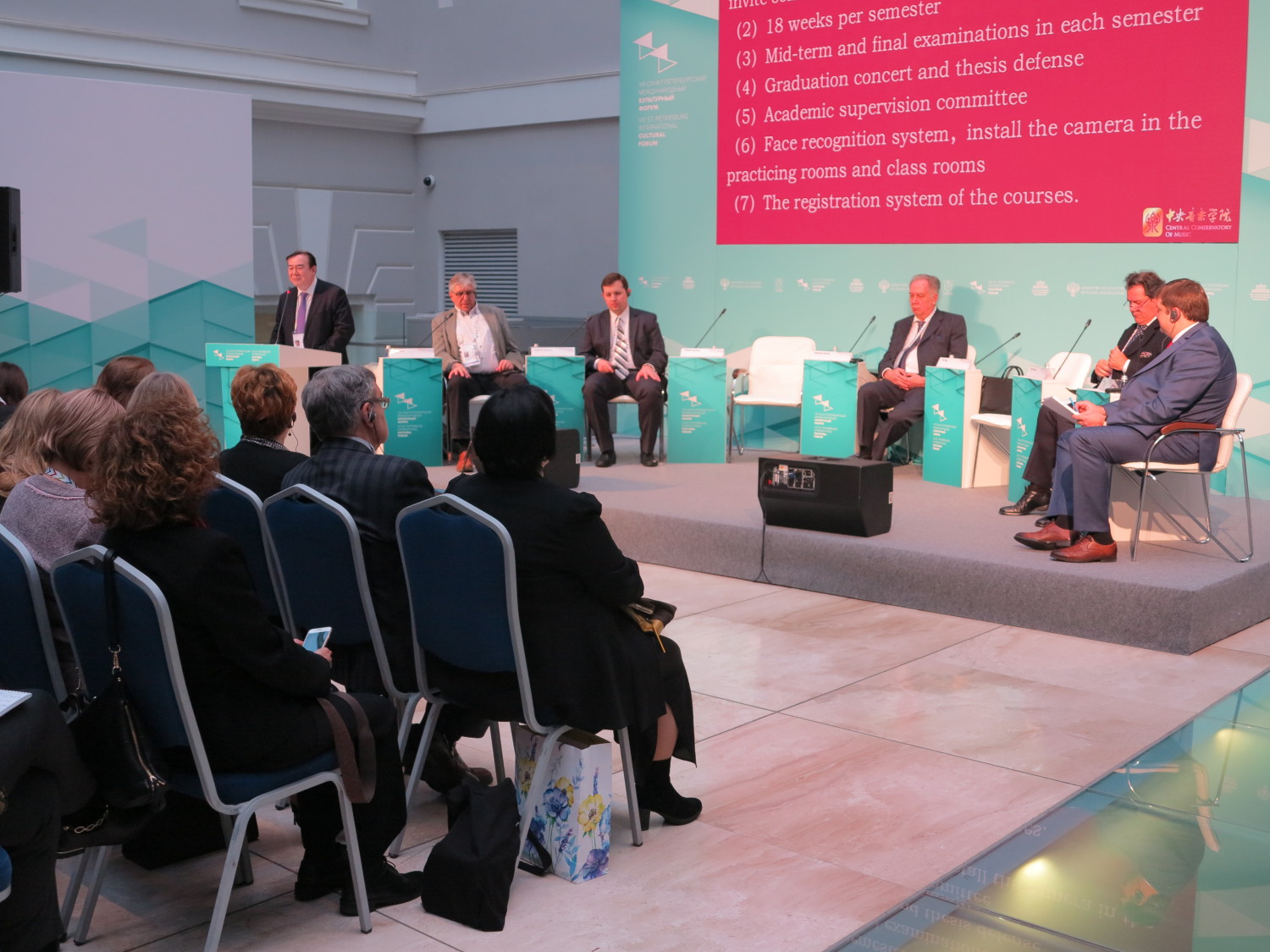 当地时间11月14日下午12时,在冬宫总参谋部大楼主会场举办了“专业艺术教育的发展前景”专题研讨会。俞峰院长作为唯一一位中国高等艺术院校代表进行了主旨发言,并与来自俄罗斯、意大利、比利时等国著名音乐学院的院长们和欧洲音乐学院协会主席等七位业内人士,共同探讨了高等音乐教育发展及青年艺术人才培养等问题。俄罗斯联邦文化部科学教育司司长娜塔莉亚女士出席了研讨会并做了总结发言。