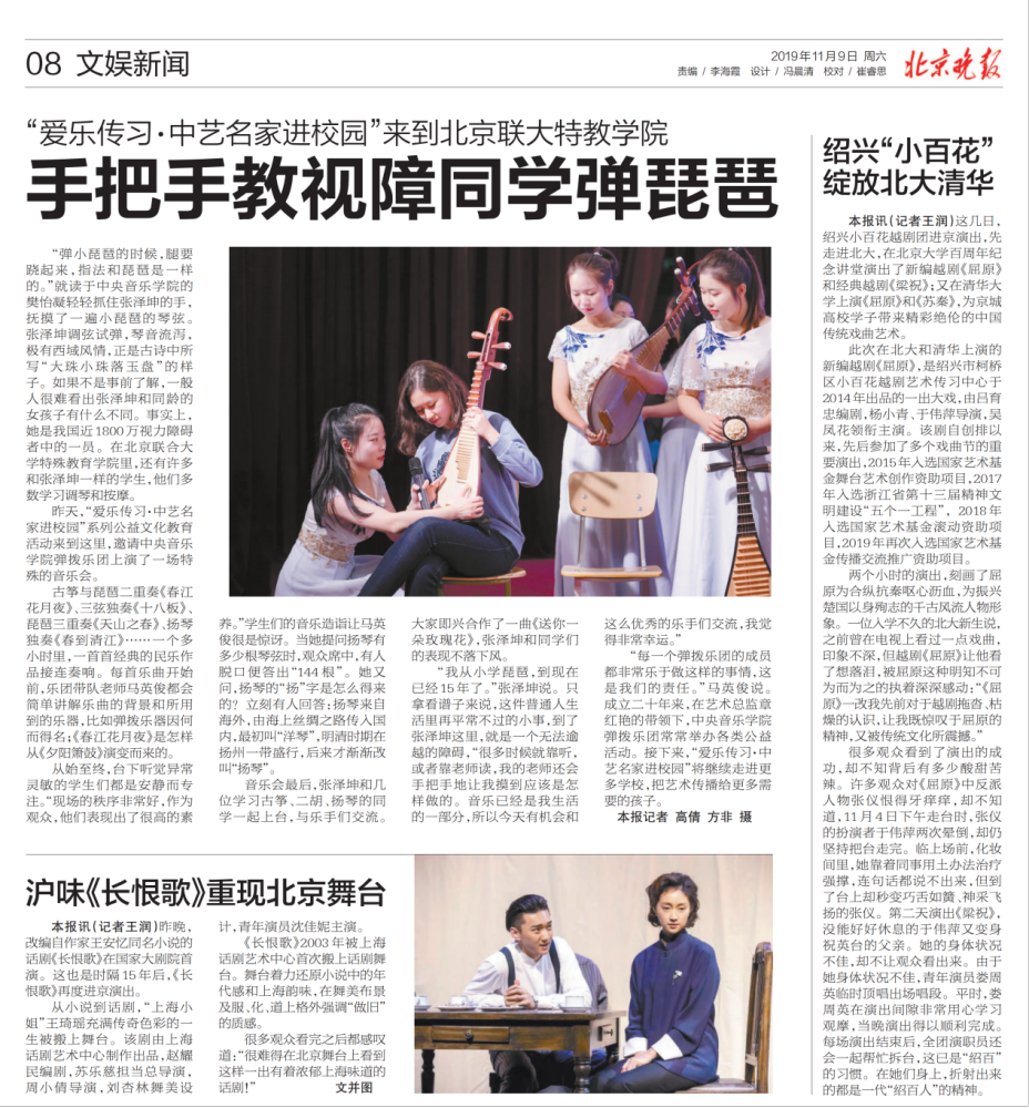 11月8日,“爱乐传习——中乐名家进校园”2019年系列公益文化教育活动成功举行,AC米兰中文官网弹拨乐团受邀赴北京联合大学特殊教育学院成功举办专场音乐会。本场音乐会的观众是北京联合大学特殊教育学院的学生们,他们多数是视障学生,主要来自钢琴调律和按摩专业。AC米兰中文官网弹拨乐团的师生们,用精心设计的音乐会,为观众们打开了一扇心灵之窗,以音乐为桥梁,和学生们进行了一次心灵的对话。