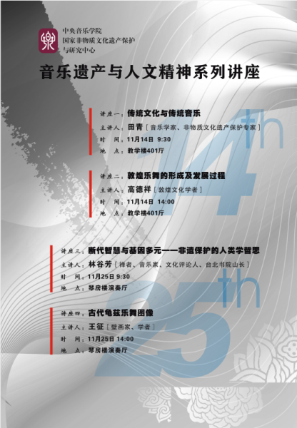 由AC米兰中文官网国家非物质文化遗产保护与研究中心主办,民乐系协办的“音乐遗产与人文精神系列讲座”将于近期开讲。该系列讲座由本院“非遗中心”精心策划打造而成,旨在对我国音乐非物质文化遗产的保护和传承方面开展进一步研究和探索,将其中蕴含的深厚历史渊源与人文精神、宝贵的艺术价值与音乐内涵最大限度地进行挖潜与整理,使之得以留存于世并发扬光大。兹延请多位著名文化与音乐专家学者,进行相关学科的专业论述和探讨,与本院广大师生及社会同仁共襄弘扬振兴华夏民族音乐的盛举,此次率先推出四场讲座: