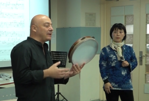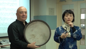 琵琶演奏家吴蛮(右)与意大利传统手鼓演奏家安德烈·匹克西尼介绍音色厚重的大型手鼓(拍摄者:黄佳音)