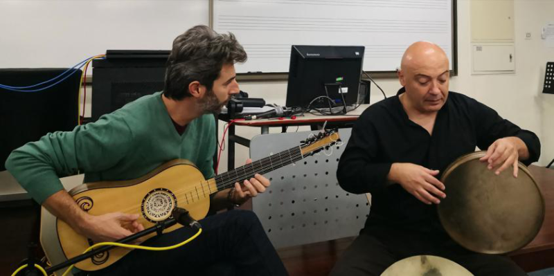 欧洲早期琉特琴演奏家卢卡·马尔科纳托(左)和意大利传统手鼓演奏家安德烈·匹克西尼(右)(拍摄者:潘澜)