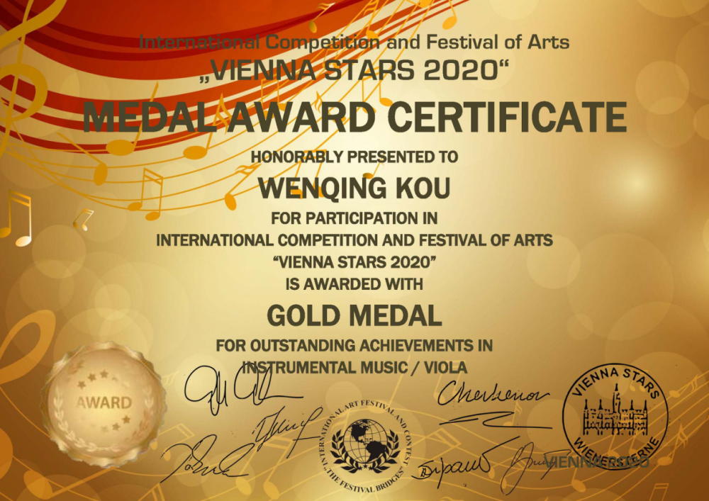 在今年的比赛中,寇文卿从来自美国、法国、德国、俄罗斯、比利时、奥地利、中国、韩国等世界各地的年轻天才音乐家中脱颖而出,经过激烈角逐和多轮评分,寇文卿的演奏获得竞赛评审团的一致好评,最终赢得成人1组一等奖(LAUREATE 1)并获得免费参加2020年12月“维也纳之星国际艺术节”欧洲盛典(GRAND EUROFEST)的机会。