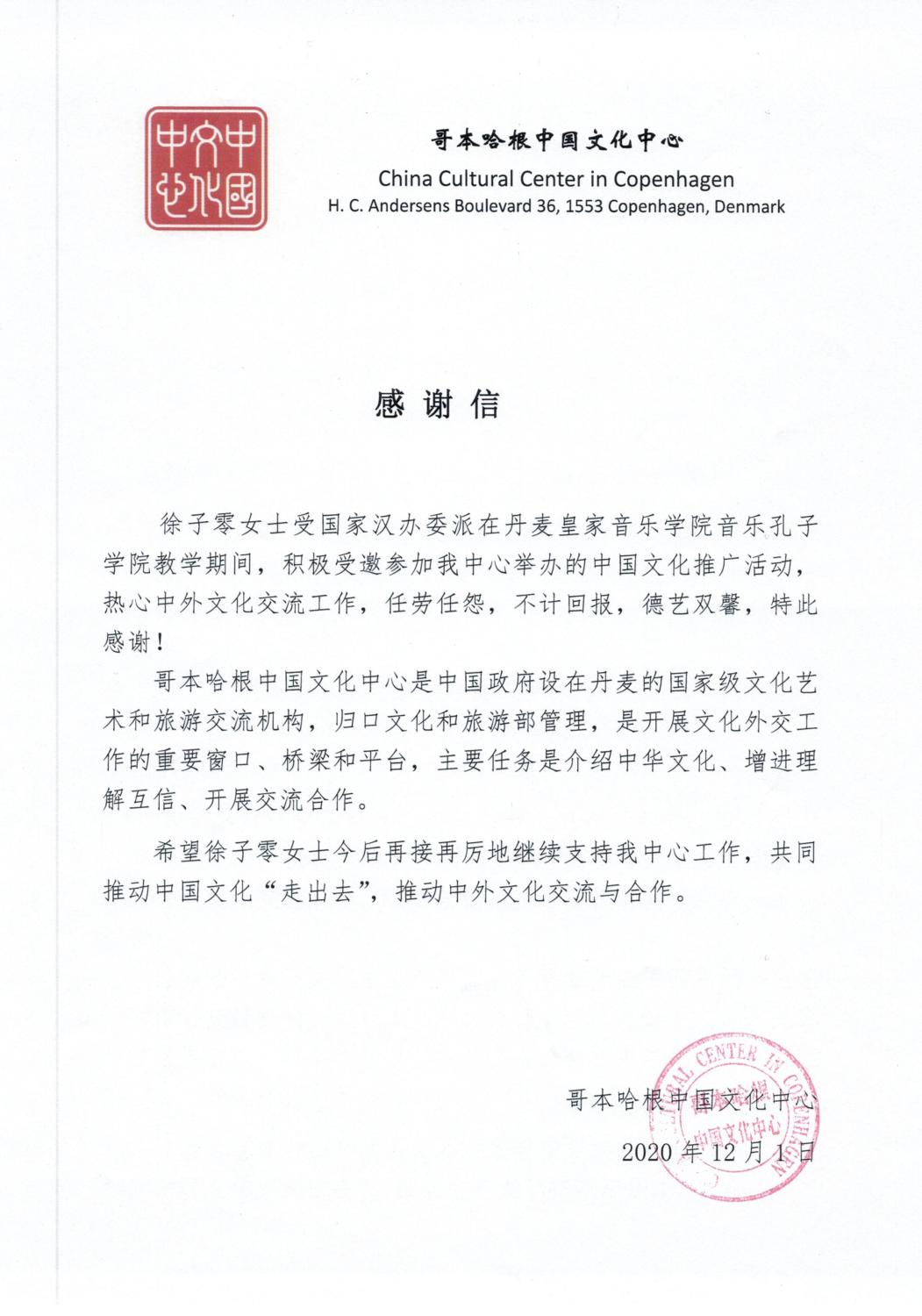 哥本哈根中国文化中心致徐子零老师的感谢信