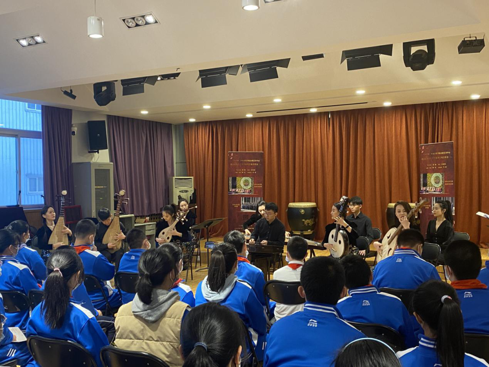 同学们在乐团成员的指导下,尝试演奏民族乐器。台上尝试、台下聆听,做好笔记、写下感悟,现场学习气氛浓厚。