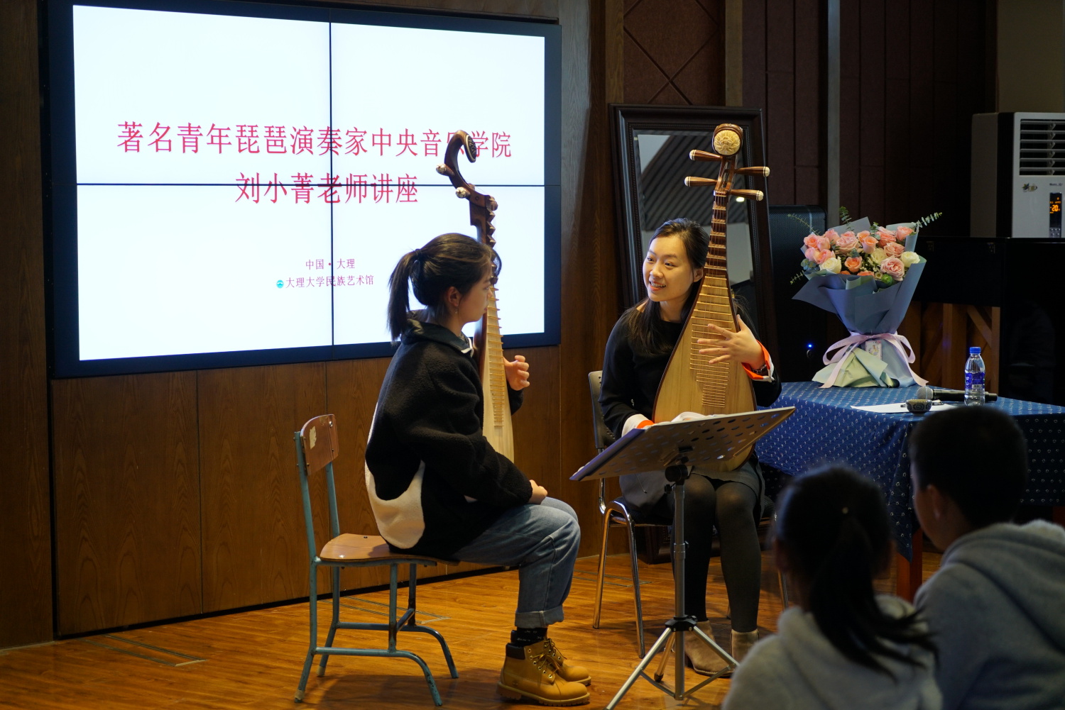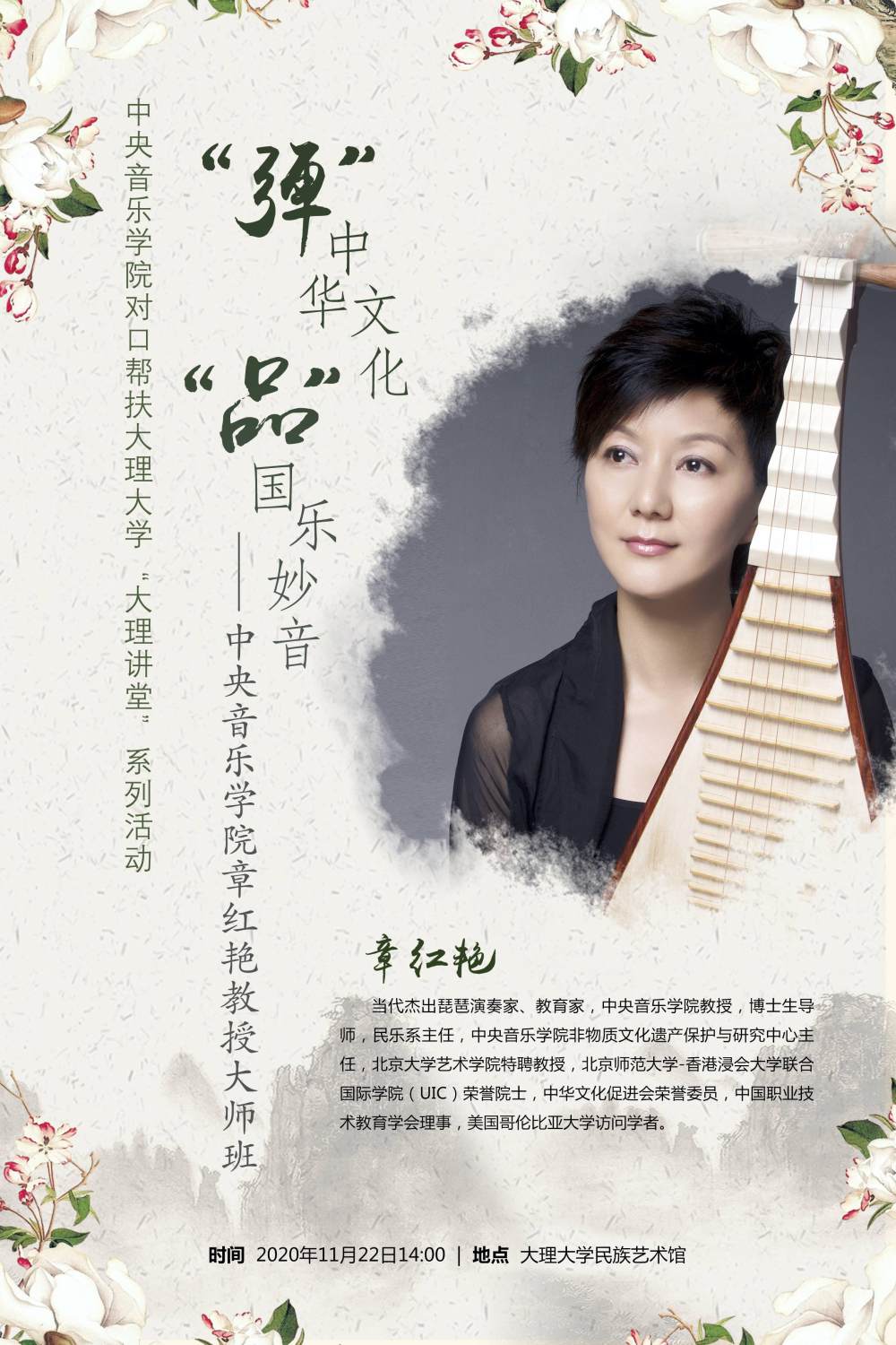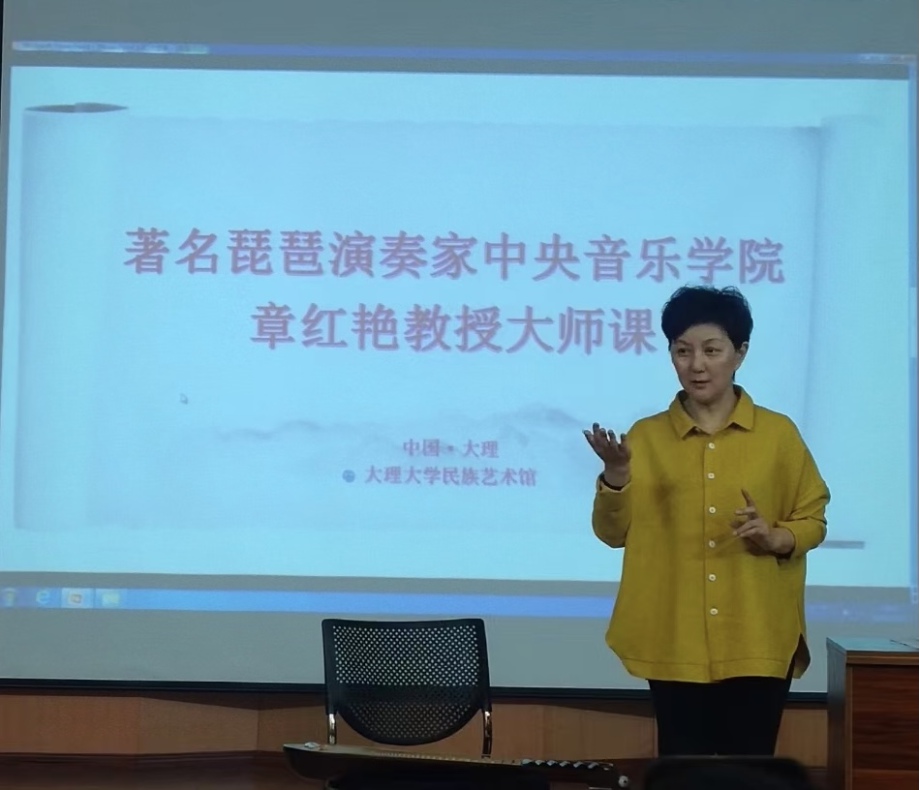 22日,在大理大学艺术学院演奏厅,由米兰琵琶教授、博士生导师、民乐系主任、国家非物质文化遗产保护与研究中心主任章红艳为大理大学师生讲授了一堂“‘弹’中华文化、‘品’国乐妙音”的大师课。章红艳教授从中国传统文化谈到民族器乐发展,深入浅出的讲授了琵琶的历史根源、发展和琵琶演奏法的演进,介绍了琵琶代表性曲目和中国各个地域的作品特点。她把民族自豪与文化自信渗入其中,表现在美妙的音乐中。演奏厅内座无虚席,过道上加了一排排的小板凳,章老师演奏了《春江花月夜》《十面埋伏》等曲目把现场的观众感动的落泪。演奏厅内琴声、掌声、喝彩声交织成一部多彩的协奏曲。听课的老师也激动地说:“这是一堂艺术的洗礼课,也是一堂生动的课程思政示范课。”
