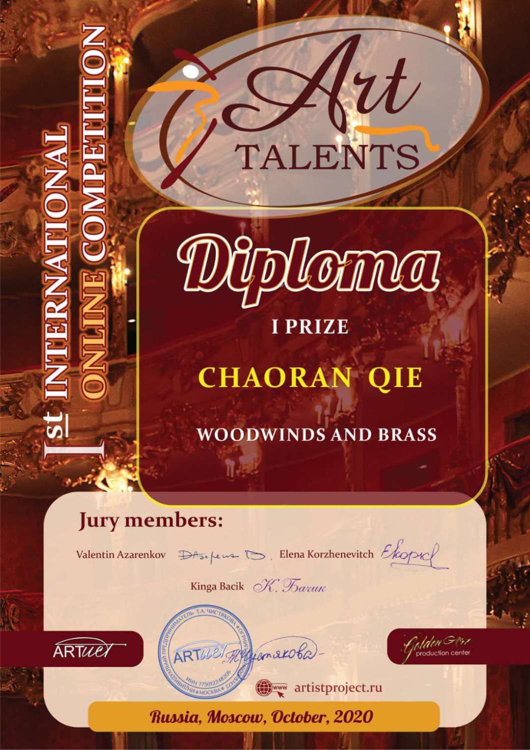 在刚刚结束的俄罗斯莫斯科国际精英音乐比赛中,米兰高一年级郄超然同学获得了管乐专业D组第一名的好成绩!(指导教师:李凌副教授)