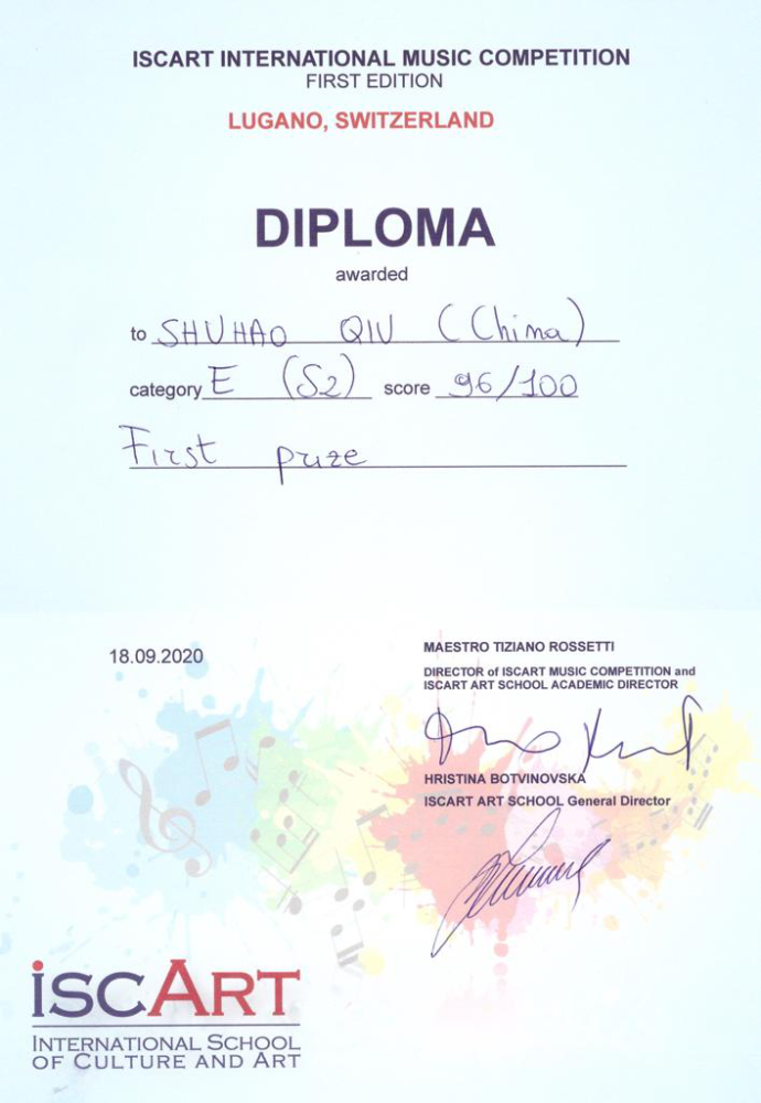 2020年9月荣获第30届意大利巴列塔之城国际青少年音乐家比赛一等奖、音乐家特别奖;