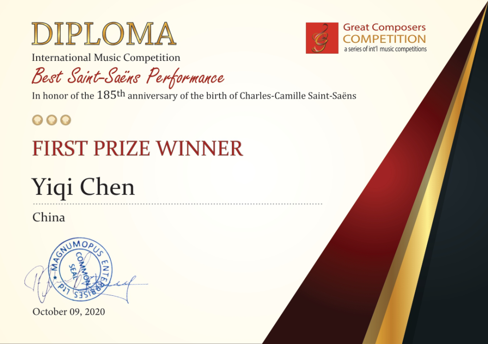 为纪念卡米尔.圣桑诞辰185周年之——卡米尔.圣桑作品国际最佳演奏奖比赛 。 “卡米尔.圣桑作品国际最佳演奏奖比赛”为“伟大音乐家比赛-国际音乐比赛系列赛”中的一项赛事。该赛事组委会为英国伦敦杰作企业,致力于为世界优秀的青少年演奏者举办一系列国际音乐比赛。 作品最佳演奏奖比赛”是这一系列比赛中的一项,纪念这位法国钢琴、管风琴演奏家、作曲家诞辰185周年。通过预选轮比赛的选手方能进入决赛。8位评委对选手提交的参赛视频进行评审,决定最终的获奖者。这次参赛者包括美国、中国、澳大利亚、波兰、加拿大、新加坡等世界各地实力强劲的参赛者。