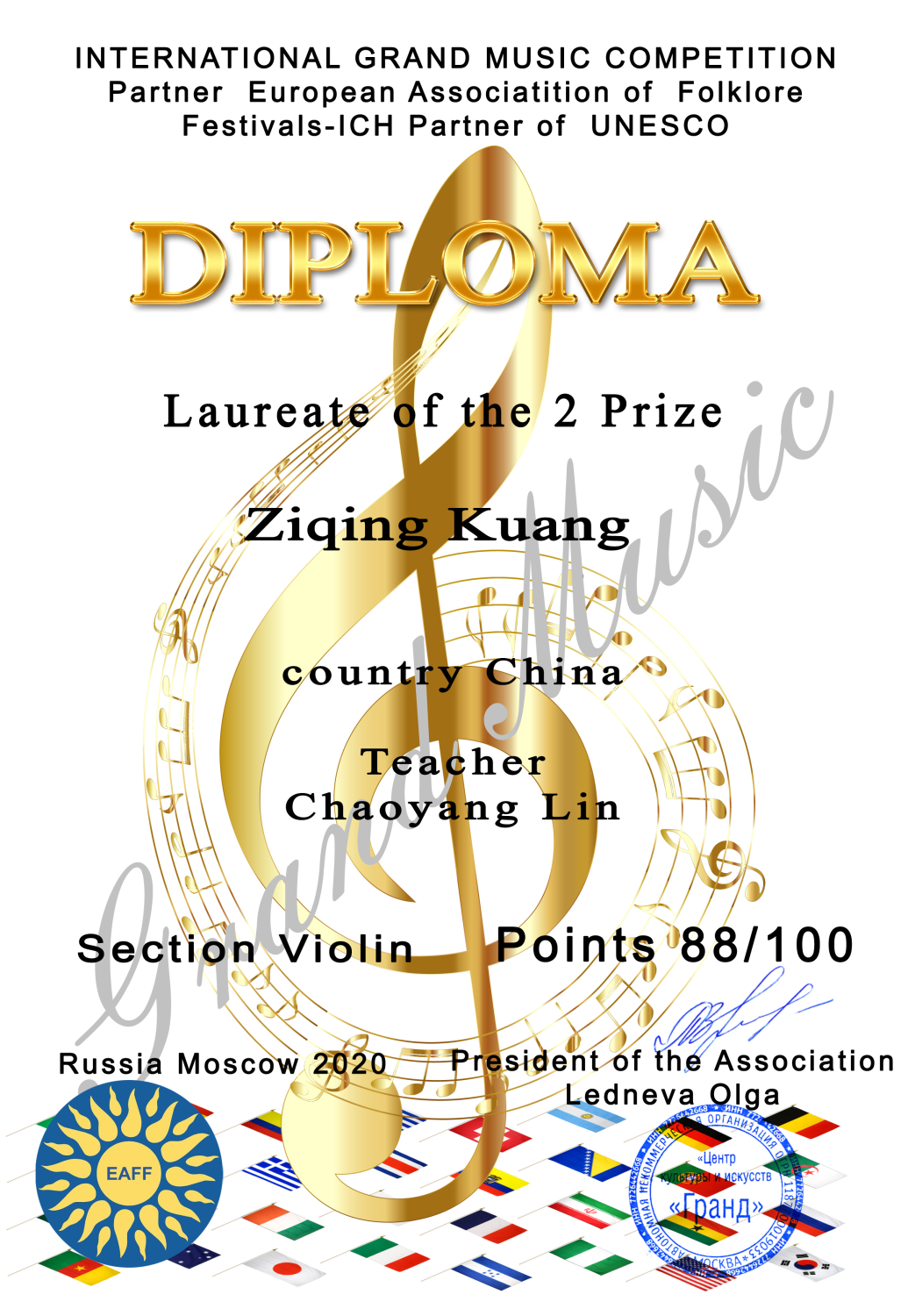 2020年获得普罗科菲耶夫国际音乐节专业少年组银奖(金奖空缺)