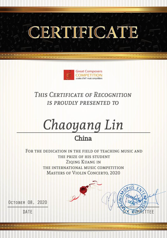 2020年8月获英国 新菁英国际音乐比赛弦乐组第一名:技巧名家奖,为弦乐组全组最高奖。并接受英国皇家音乐学院副董事的采访,在国内外各大媒体中发布。