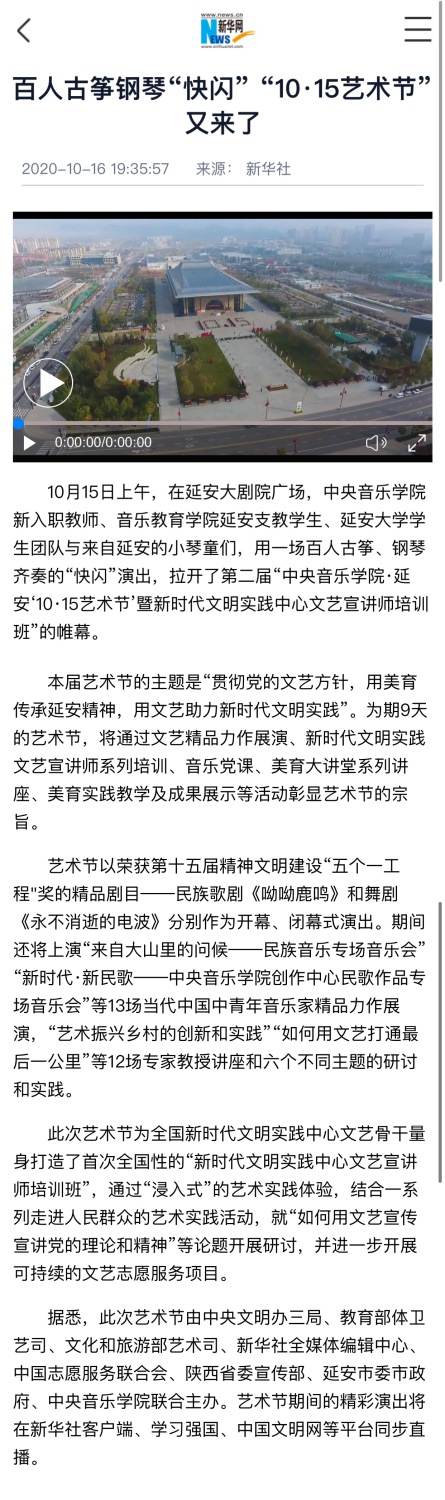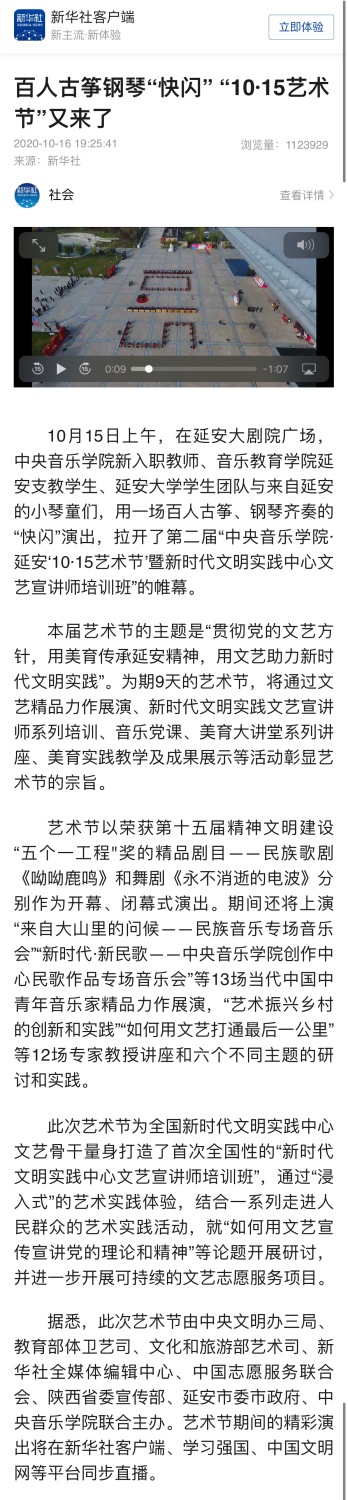 同时,此次活动的重要场次釆用“线上云直播”的方式,让更多的群众能收看活动盛况,感受我国当代文艺的繁荣,满足大众对精神文化的需求。新华社客户端、人民日报客户端、学习强国学习平台、中国文明网、央视频、央视新闻、光明日报客户端、央音视频、央音哔哩哔哩等平台进行直播,观看人数近4000万!