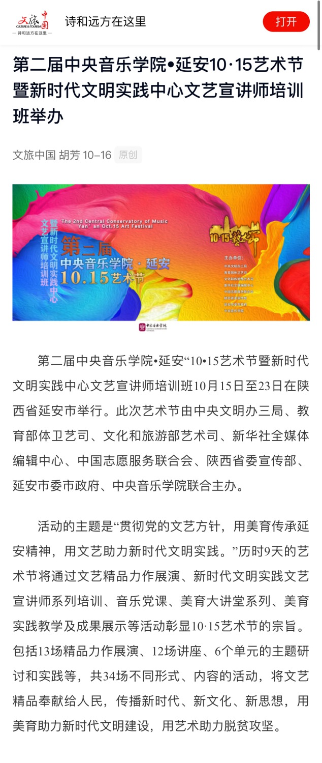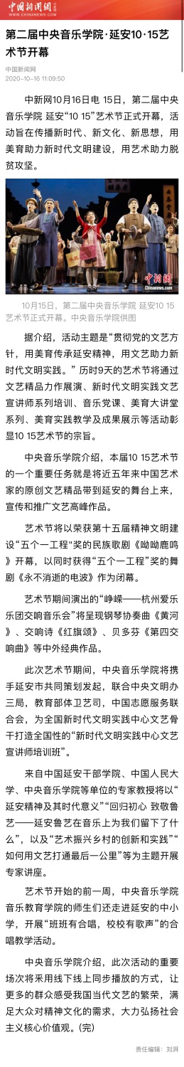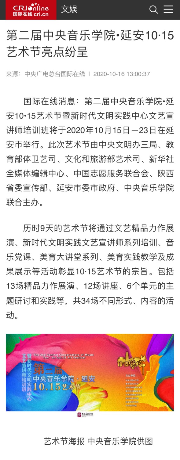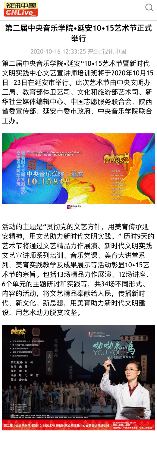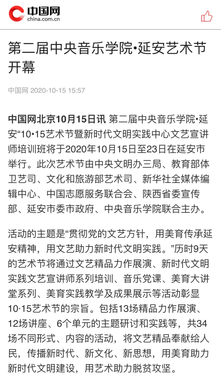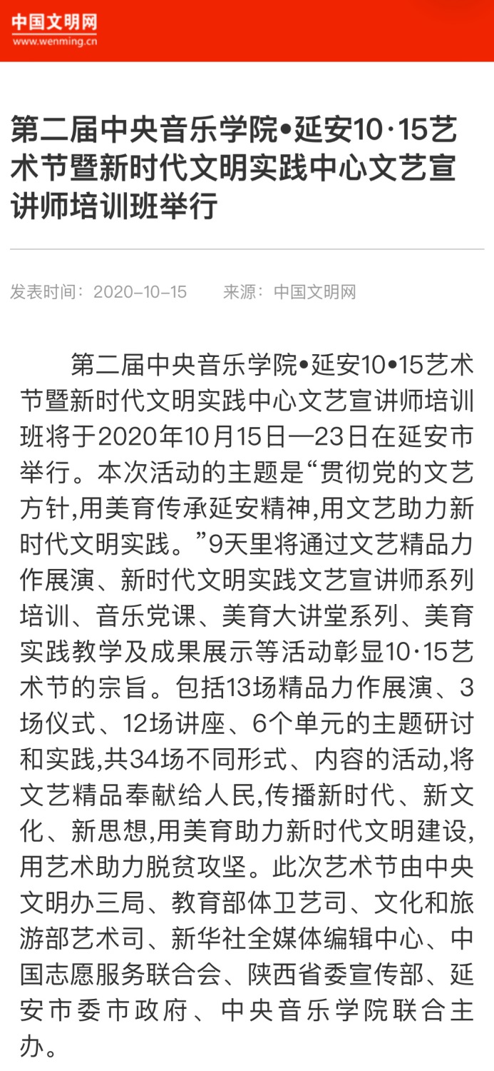 第二届AC米兰中文官网•延安“10•15艺术节暨新时代文明实践中心文艺宣讲师培训班于2020年10月15日—23日在延安市举行。此次艺术节由中央文明办三局、教育部体卫艺司、文化和旅游部艺术司、新华社全媒体编辑中心、中国志愿服务联合会、陕西省委宣传部、延安市委市政府、AC米兰中文官网联合主办。