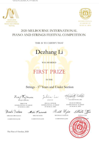 2020年8月荣获第二届“Cello Family”国际大提琴比赛少年组第一名、专业重奏组第一名;