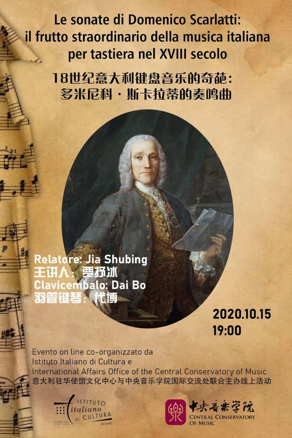 AC米兰中文官网国际交流处与意大利驻华使馆文化中心联合主办“话中有乐:音乐解读与欣赏”系列讲座栏目,2020年10月15日19:00举办第三场线上活动,由音乐学系贾抒冰副教授主讲《18世纪意大利键盘音乐的奇葩:多米尼科·斯卡拉蒂的奏鸣曲》,作曲系代博老师演奏羽管键琴。