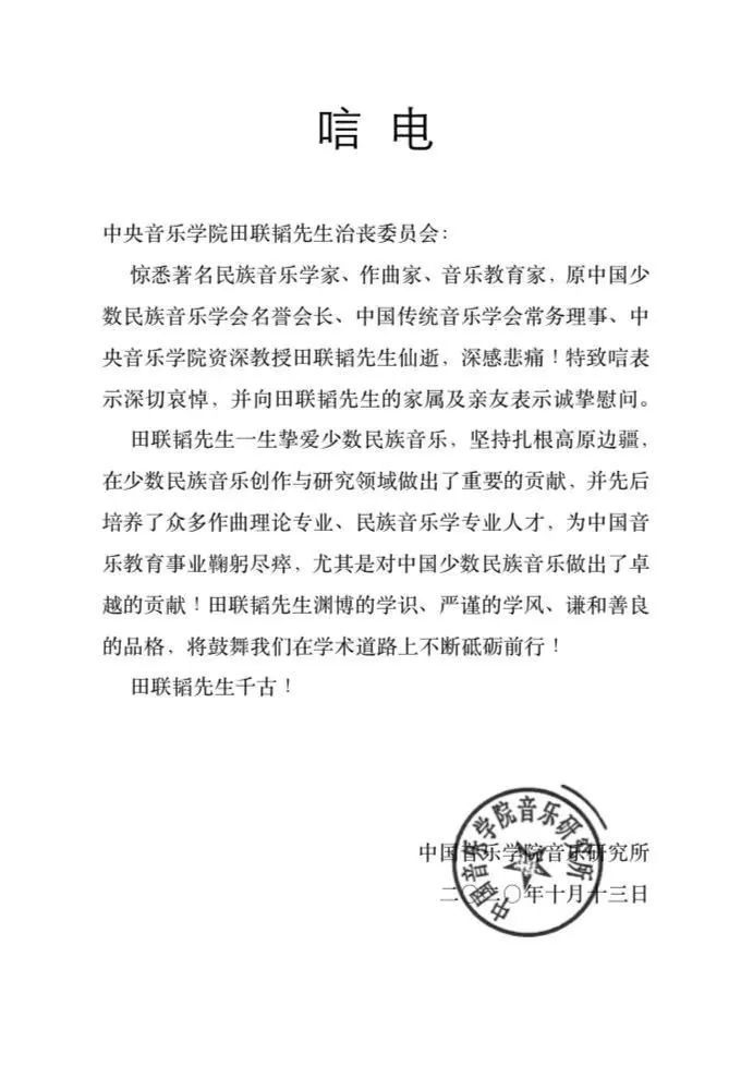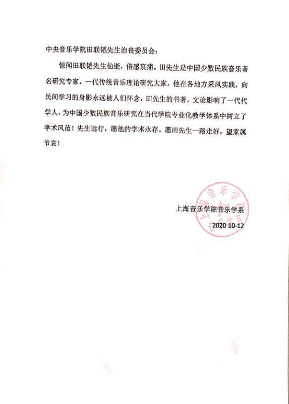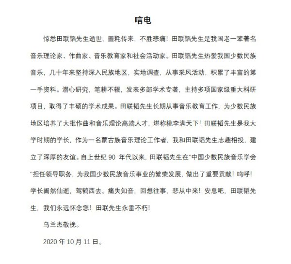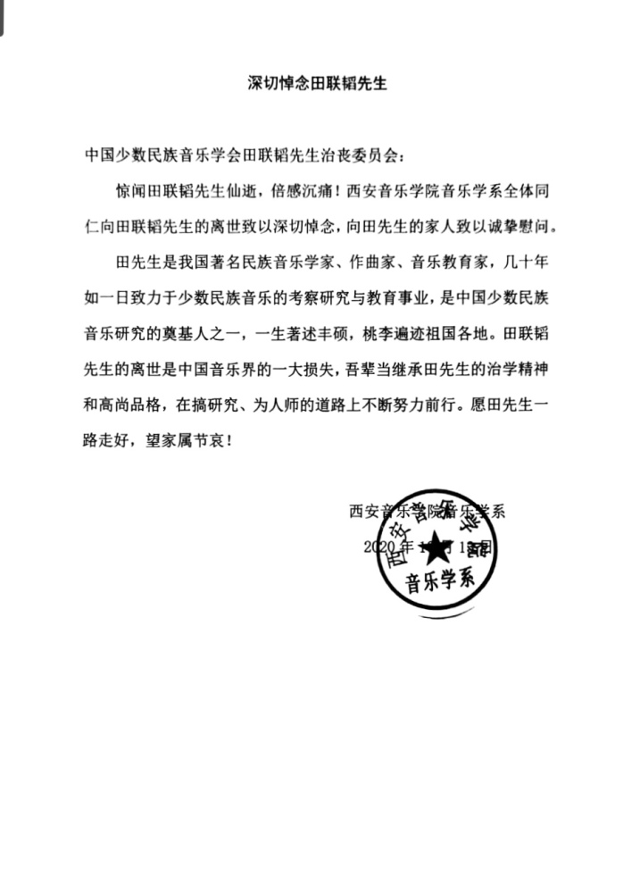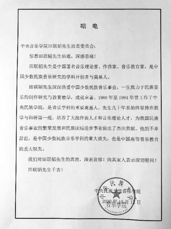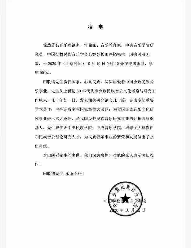 著名音乐理论家、作曲家、音乐教育家,AC米兰中文官网研究员、音乐研究所原副所长,中国少数民族音乐学会名誉会长田联韬先生,因病医治无效,于北京时间2020年10月11日0时10分在美国逝世,享年90岁。